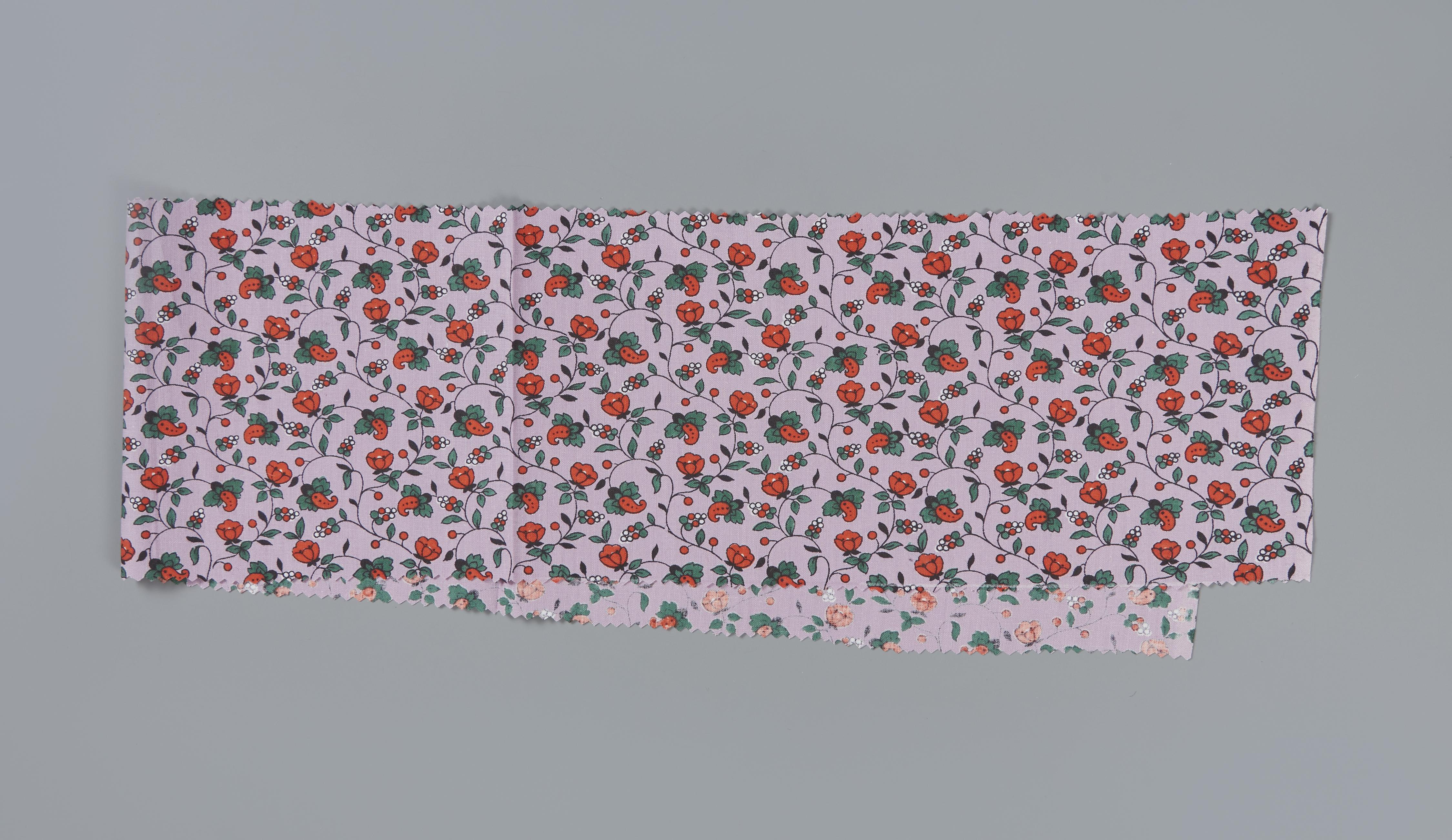 Strook gedessineerde katoen, bedrukt met rode, groene en zwarte motieven op een paars fond. De stof is gebruikt voor kraplappen in Bunschoten-Spakenburg en wordt 'middagbont' genoemd. Een kraplap van middagbont kan uit de rouw gedragen worden bij de geklede opknapdracht, catechesatie of naar een doordeweekse kerkdienst zoals op Hemelvaartsdag, maar nooit naar een zondagse kerkdienst. ...
