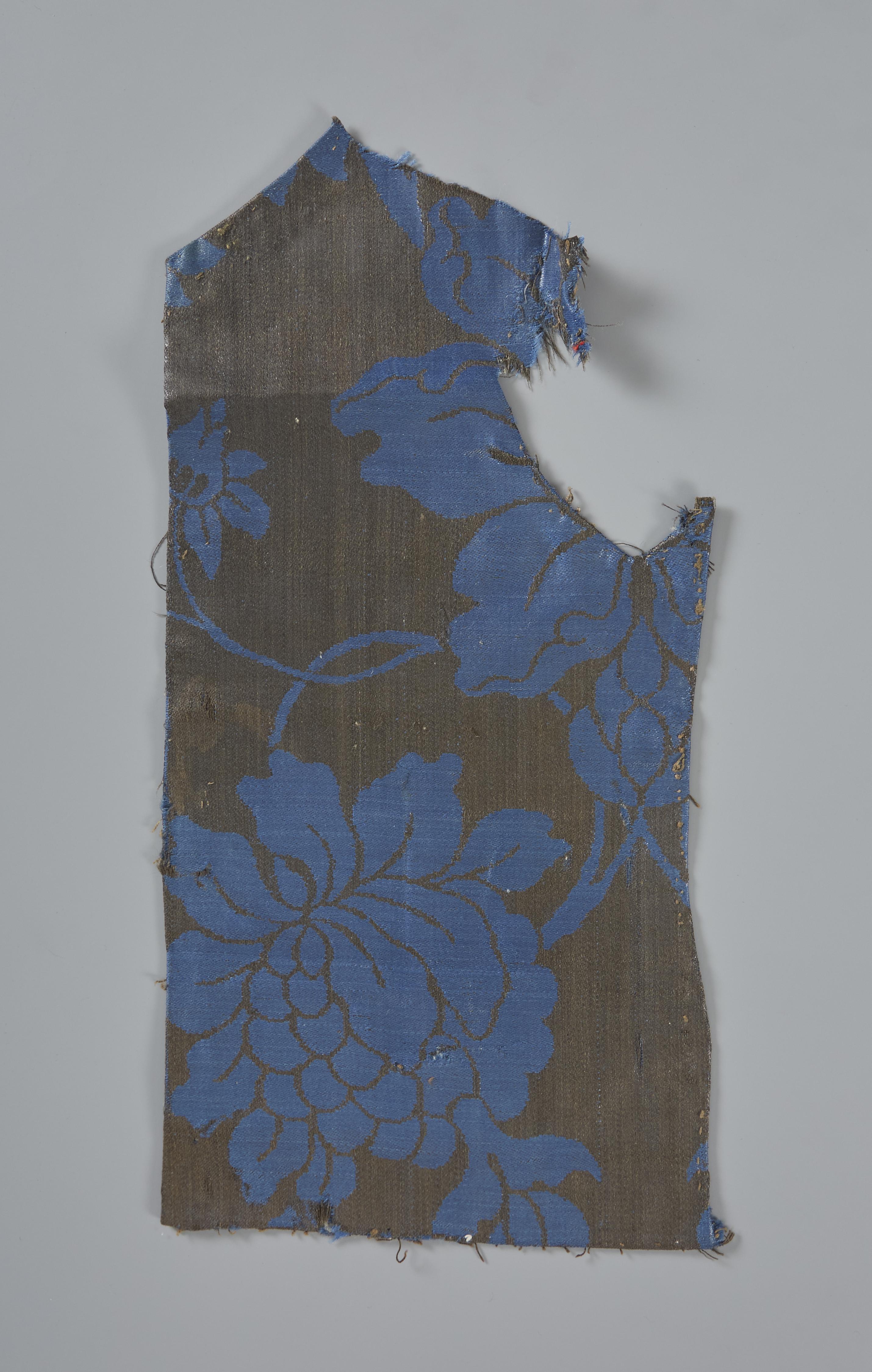 Een linker voorpand van een kledingstuk, geknipt uit gekalanderde wollen damast. Dergelijke wollen damast werd in Norwich geweven. Het dessin bestaat uit blauwe motieven op een grijsbruin fond. Het patroon heeft een fors rapport.