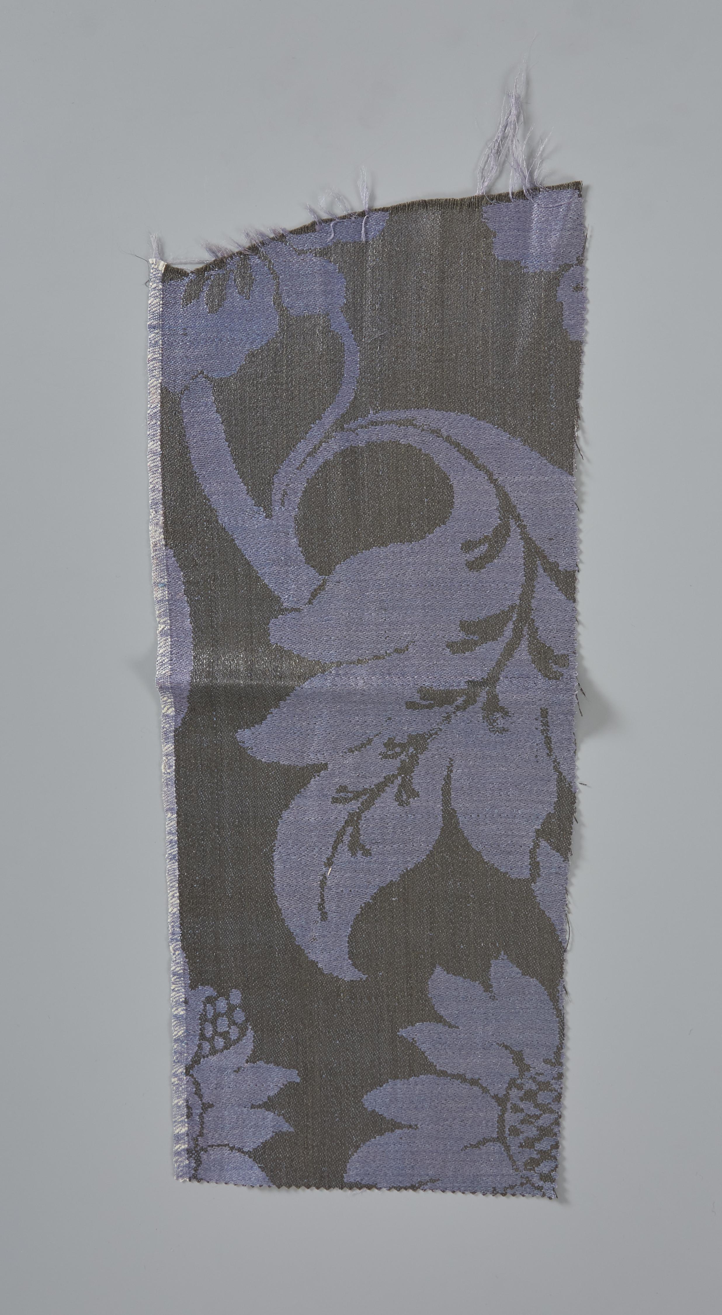 Een stuk gekalanderde wollen damast. Dergelijke wollen damast werd in Norwich geweven. Het dessin bestaat uit blauwe motieven op een blauwzwart fond. Het patroon heeft een fors rapport.