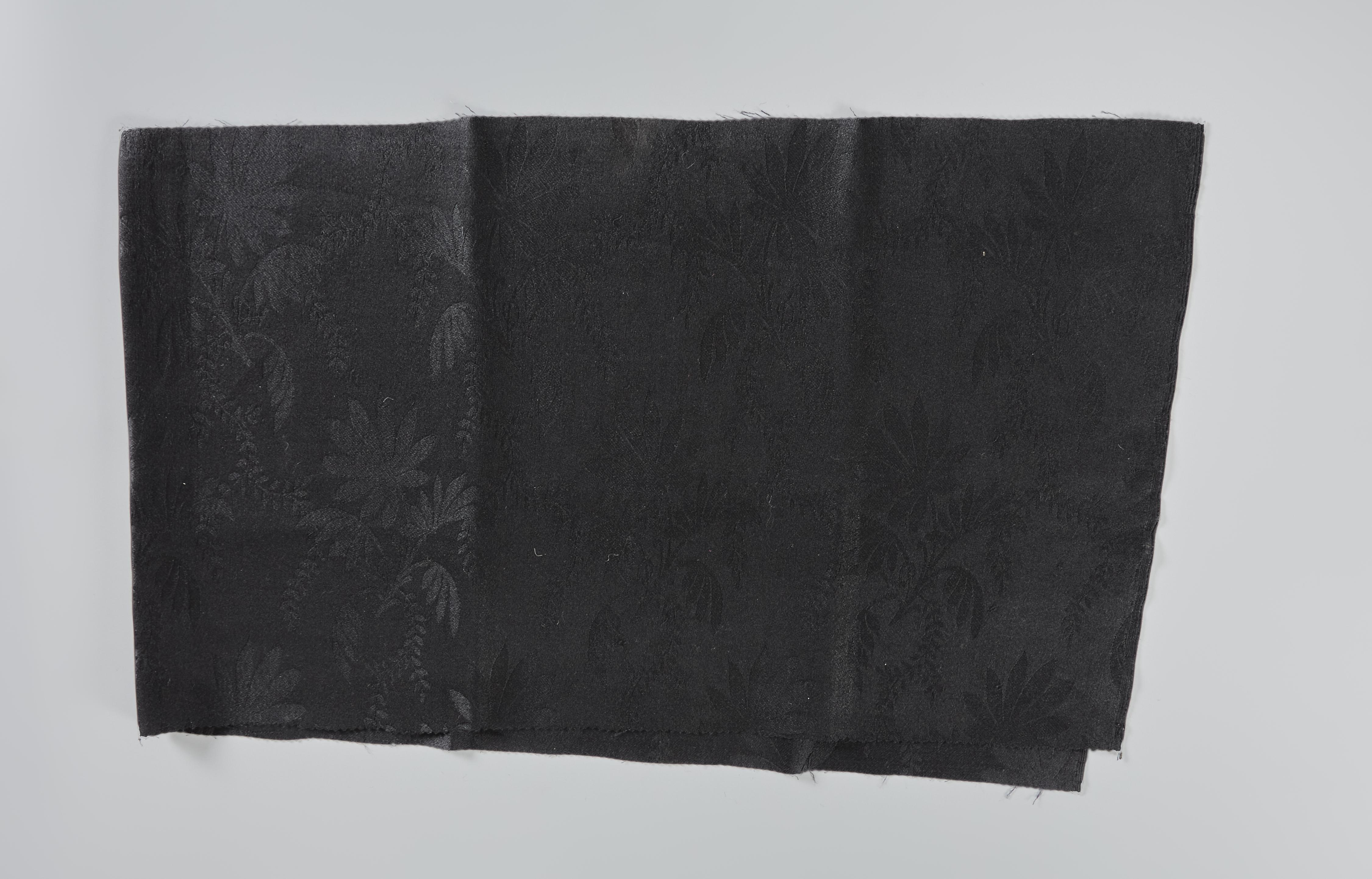 Lap zwarte wollen damast. De weefbreedte van de stof is 122 centimeter. In verschillende Nederlandse streekdrachten is dit type damast gebruikt voor onder- of tussenrokken, bijvoorbeeld op de Veluwe en voor de 'bloemerok' in Huizen.