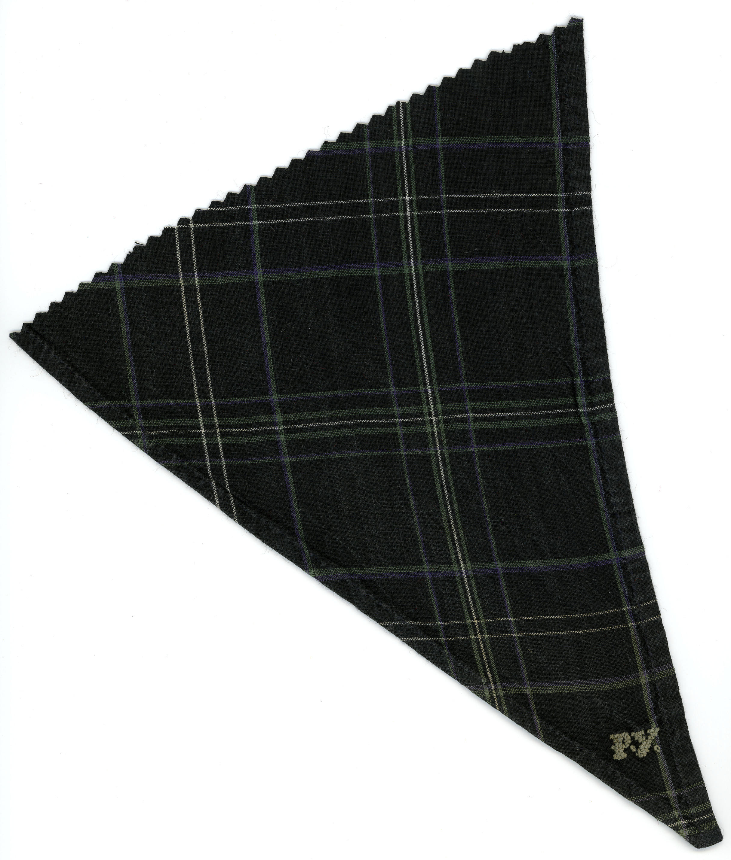 Fragment van een halsdoek van geruite katoen, gedragen door een man of jongen in Marker streekdracht. In de punt zijn de initialen 'PY' geborduurd met groen garen. De zomen zijn met de hand gezoomd.