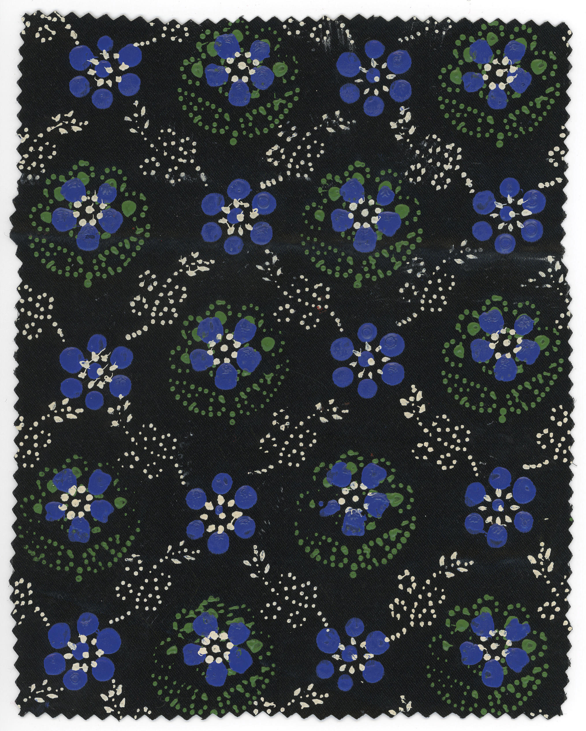 Stuk zwart satijn met een blauw-wit-groen stipwerkdessin. De motieven zijn kleur voor kleur en motief voor motief op de stof aangebracht met behulp van stempels. Deze stof werd in Staphorst en Rouveen onder meer gebruikt voor kinderkleding, doordeweekse mutsen en kraplappen in de lichte rouw.