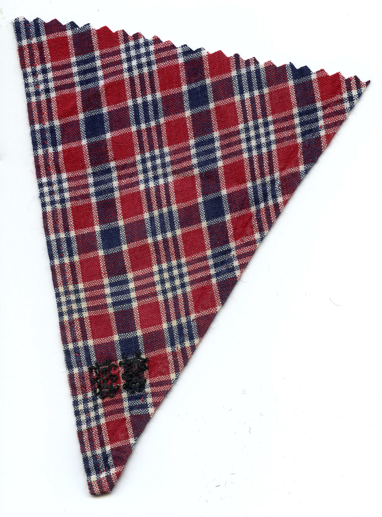 Fragment van een halsdoek van geruite katoen, gedragen door een man of jongen in Marker streekdracht. In de punt zijn de initialen 'IP' geborduurd met zwart garen. De zomen zijn met de hand gezoomd.