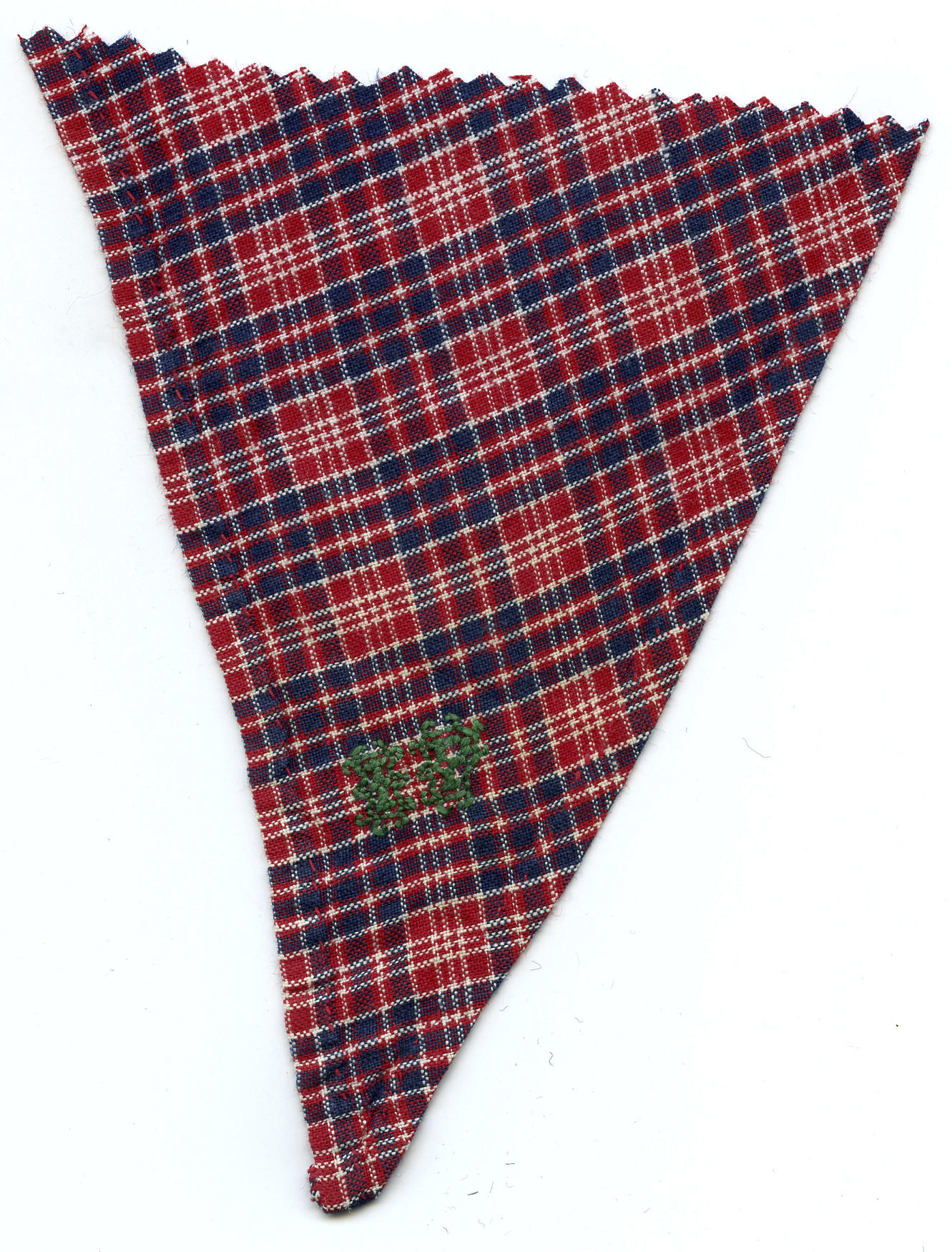 Fragment van een halsdoek van geruite katoen, gedragen door een man of jongen in Marker streekdracht. In de punt zijn de initialen 'IP' geborduurd met groen garen. De zomen zijn met de hand gezoomd.