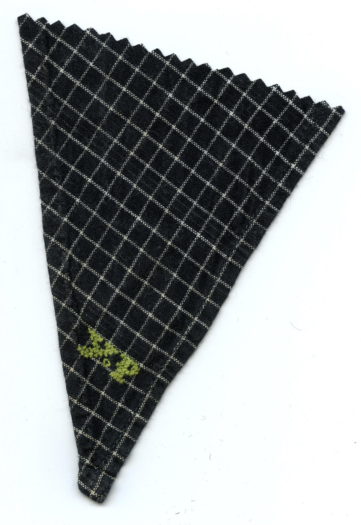 Fragment van een halsdoek van geruite katoen, gedragen door een man of jongen in Marker streekdracht. In de punt zijn de initialen 'YP' geborduurd met groen garen. De zomen zijn met de hand en machinaal gezoomd.