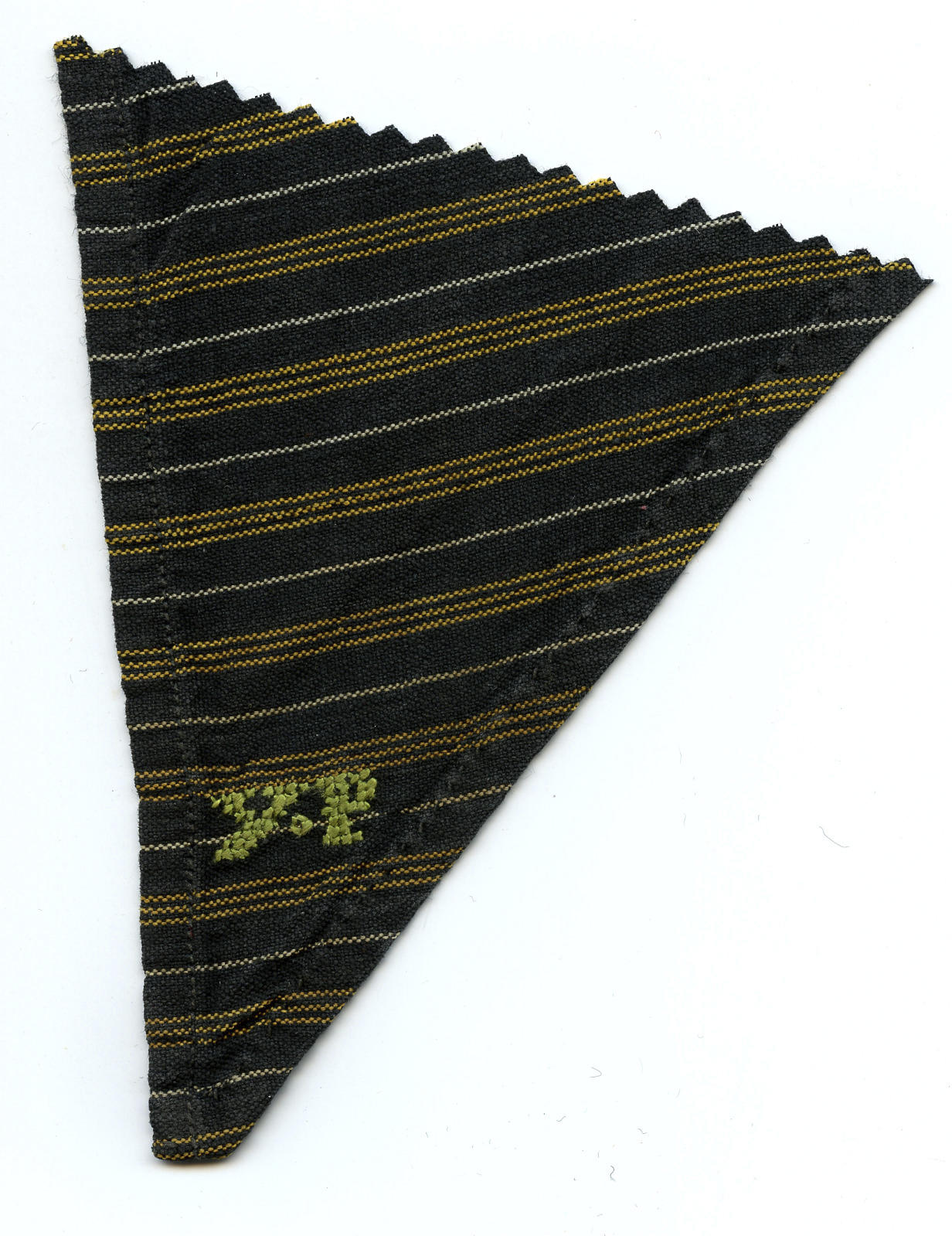 Fragment van een halsdoek van gestreepte katoen, gedragen door een man of jongen in Marker streekdracht. In de punt zijn de initialen 'YP' geborduurd met groen garen. De zomen zijn met de hand en machinaal gezoomd.