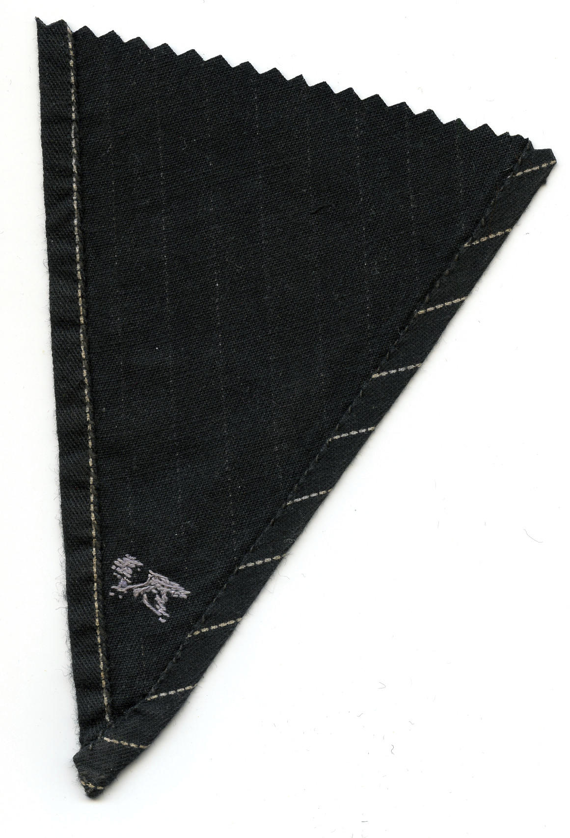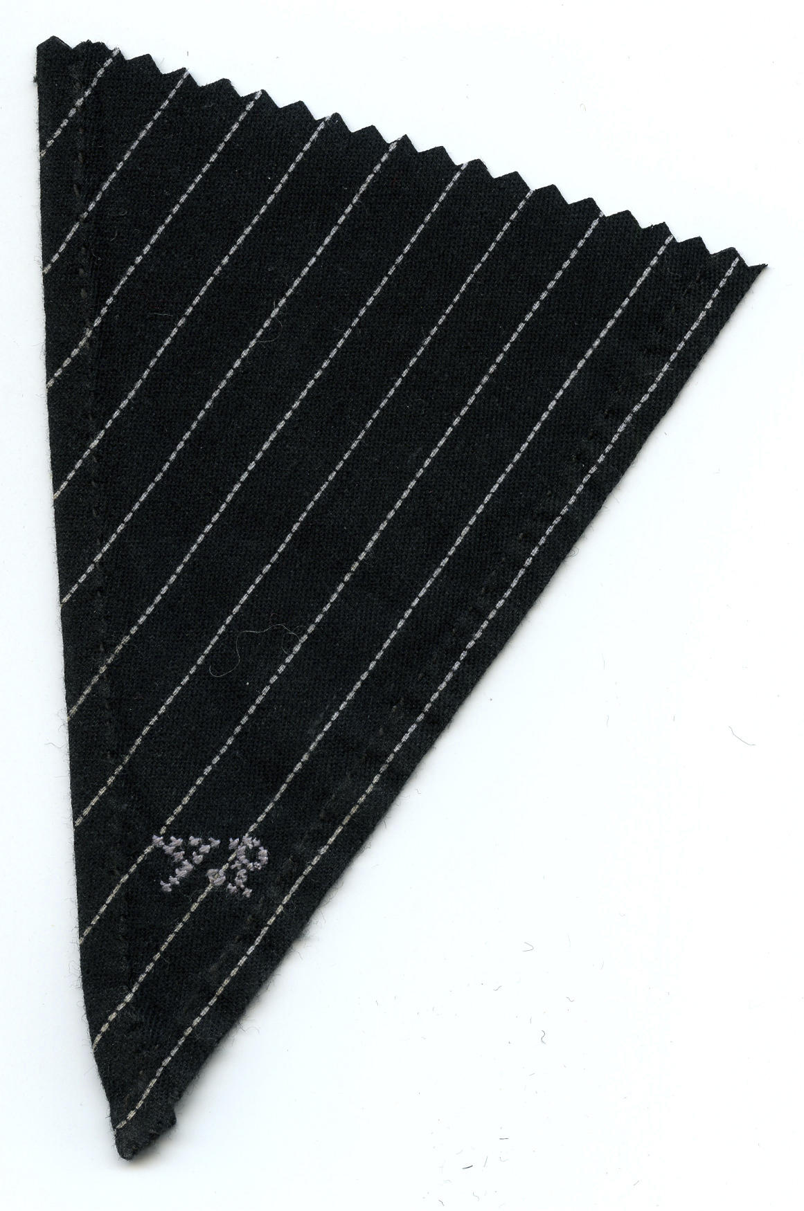 Fragment van een halsdoek van gesteepte katoen, gedragen door een man of jongen in Marker streekdracht. In de punt zijn de initialen 'YP' geborduurd met grijs garen. De zomen zijn met de hand gezoomd.