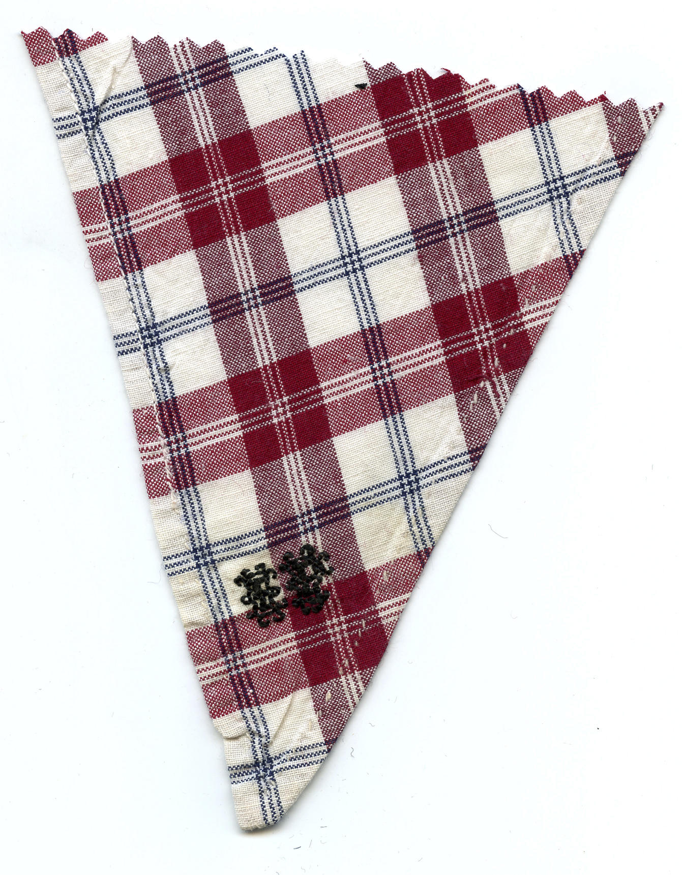 Fragment van een halsdoek van geruite katoen, gedragen door een man of jongen in Marker streekdracht. In de punt zijn de initialen 'IP' geborduurd met zwart garen. De zomen zijn met de hand en machinaal gezoomd.