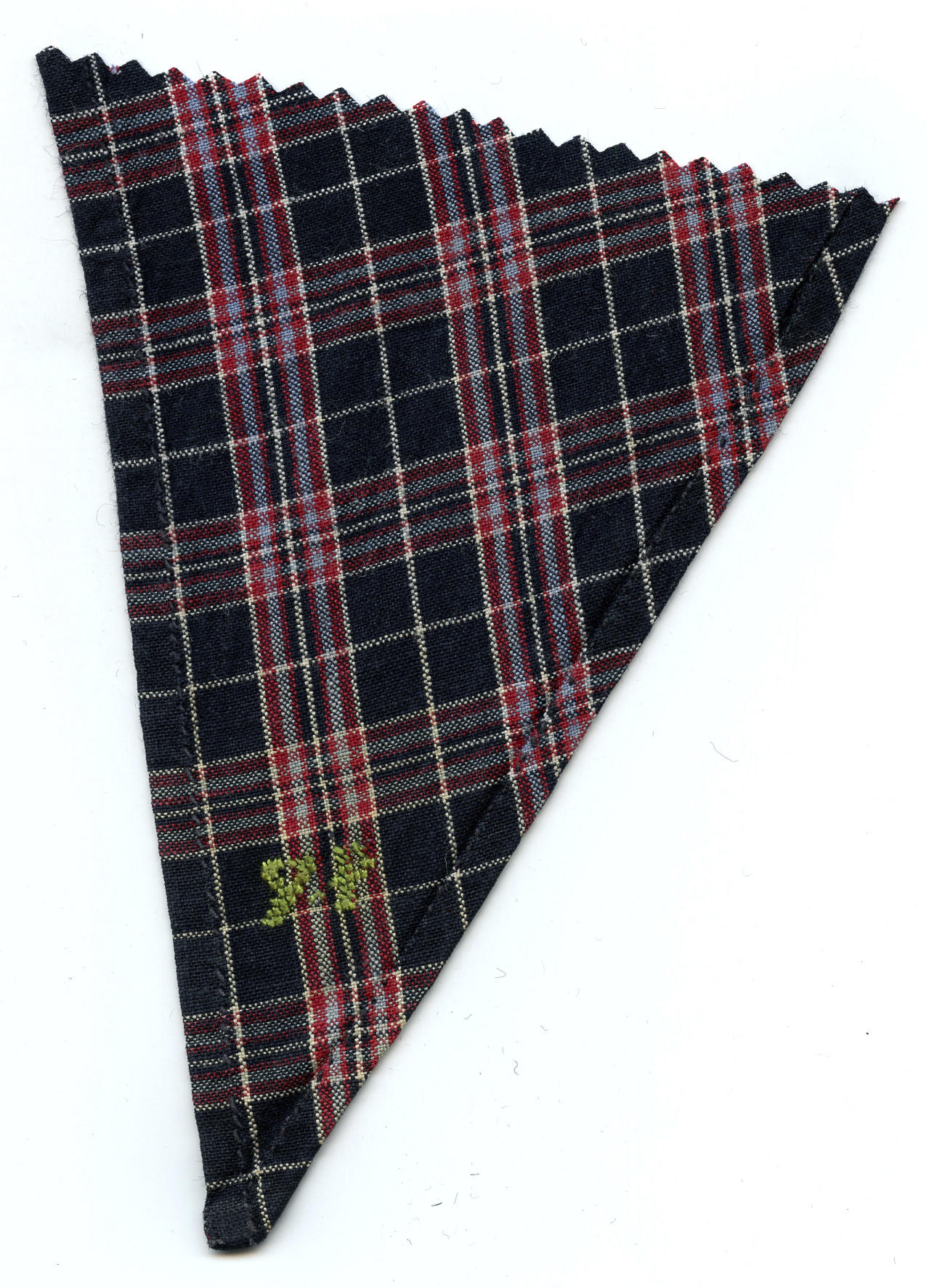 Fragment van een halsdoek van geruite katoen, gedragen door een man of jongen in Marker streekdracht. In de punt zijn de initialen 'YP' geborduurd met groen garen. De zomen zijn met de hand gezoomd.