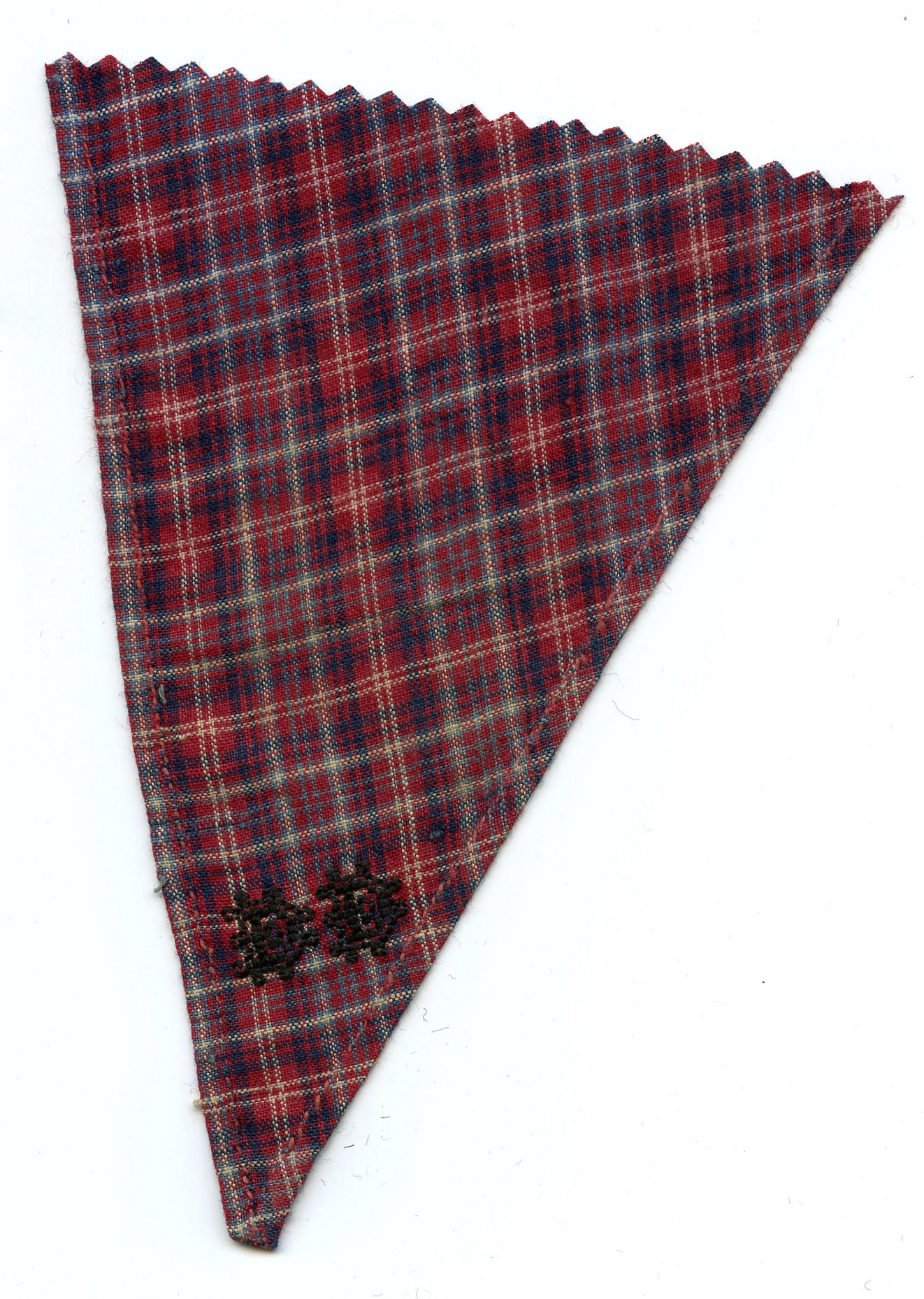 Fragment van een halsdoek van geruite katoen, gedragen door een man of jongen in Marker streekdracht. In de punt zijn de initialen 'DD' geborduurd met zwart garen. De zomen zijn met de hand gezoomd.