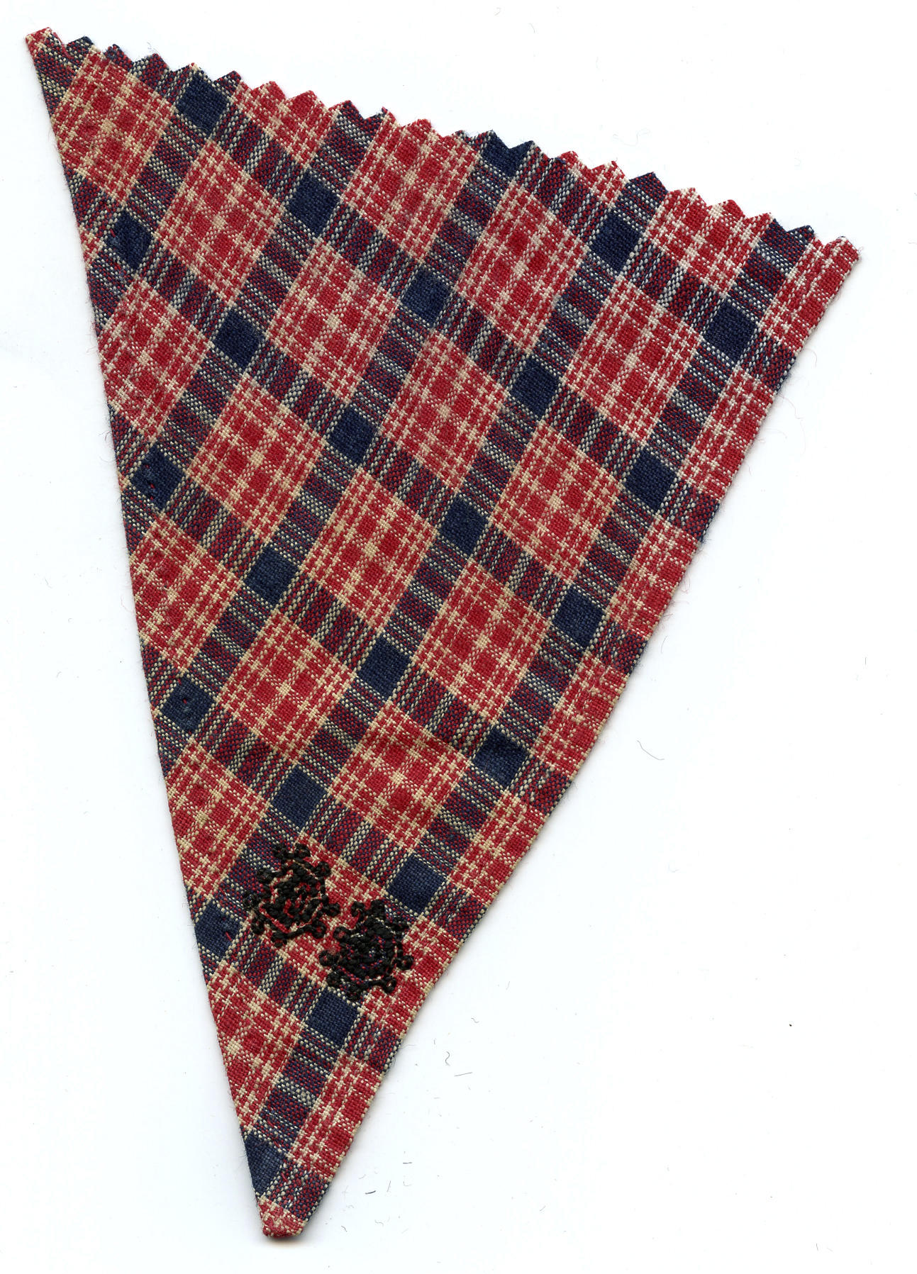 Fragment van een halsdoek van geruite katoen, gedragen door een man of jongen in Marker streekdracht. In de punt zijn de initialen 'DD' geborduurd met zwart garen. De zomen zijn met de hand gezoomd.