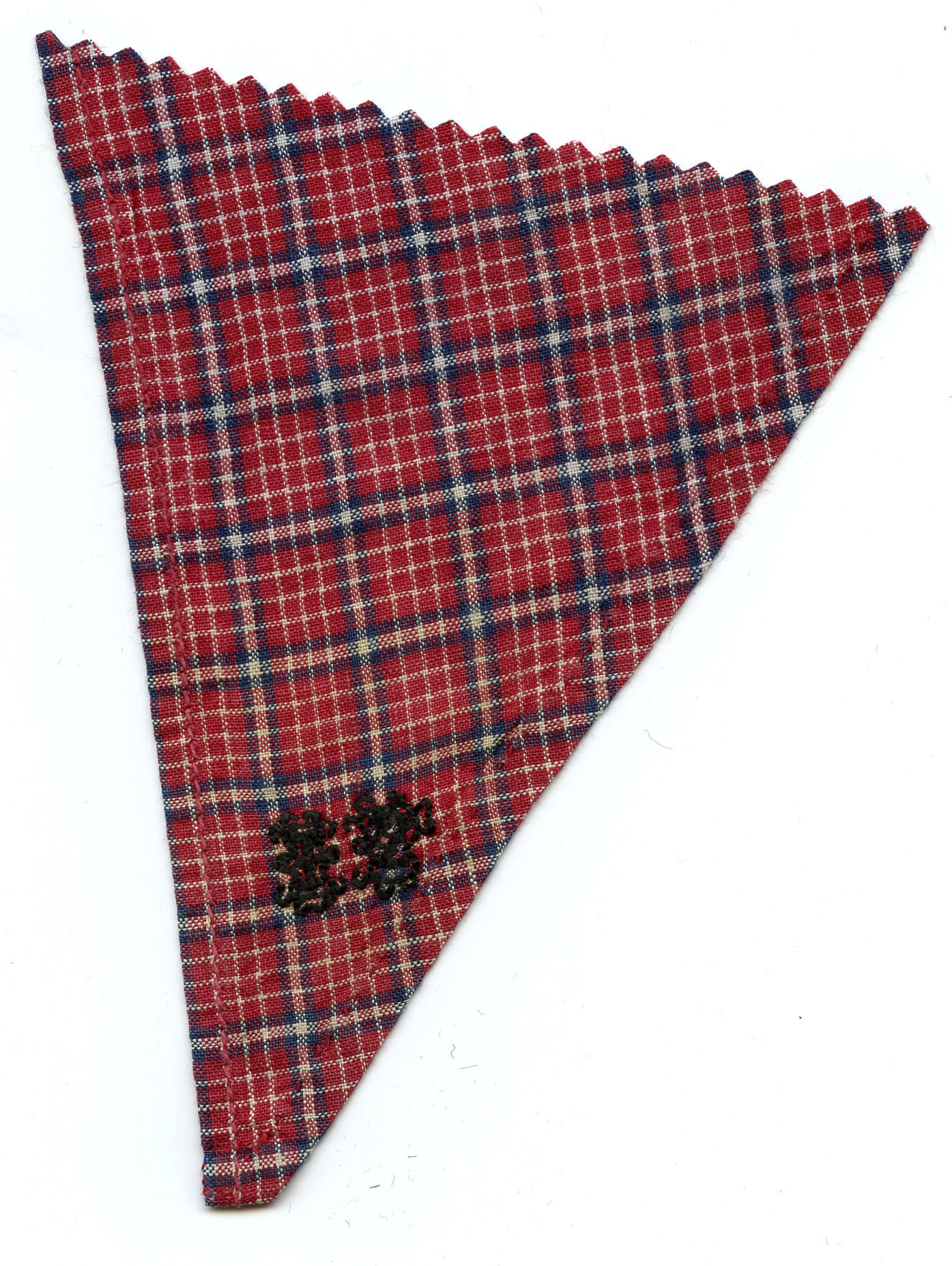 Fragment van een halsdoek van geruite katoen, gedragen door een man of jongen in Marker streekdracht. In de punt zijn de initialen 'IP' geborduurd met zwart garen. De zomen zijn met de hand gezoomd.