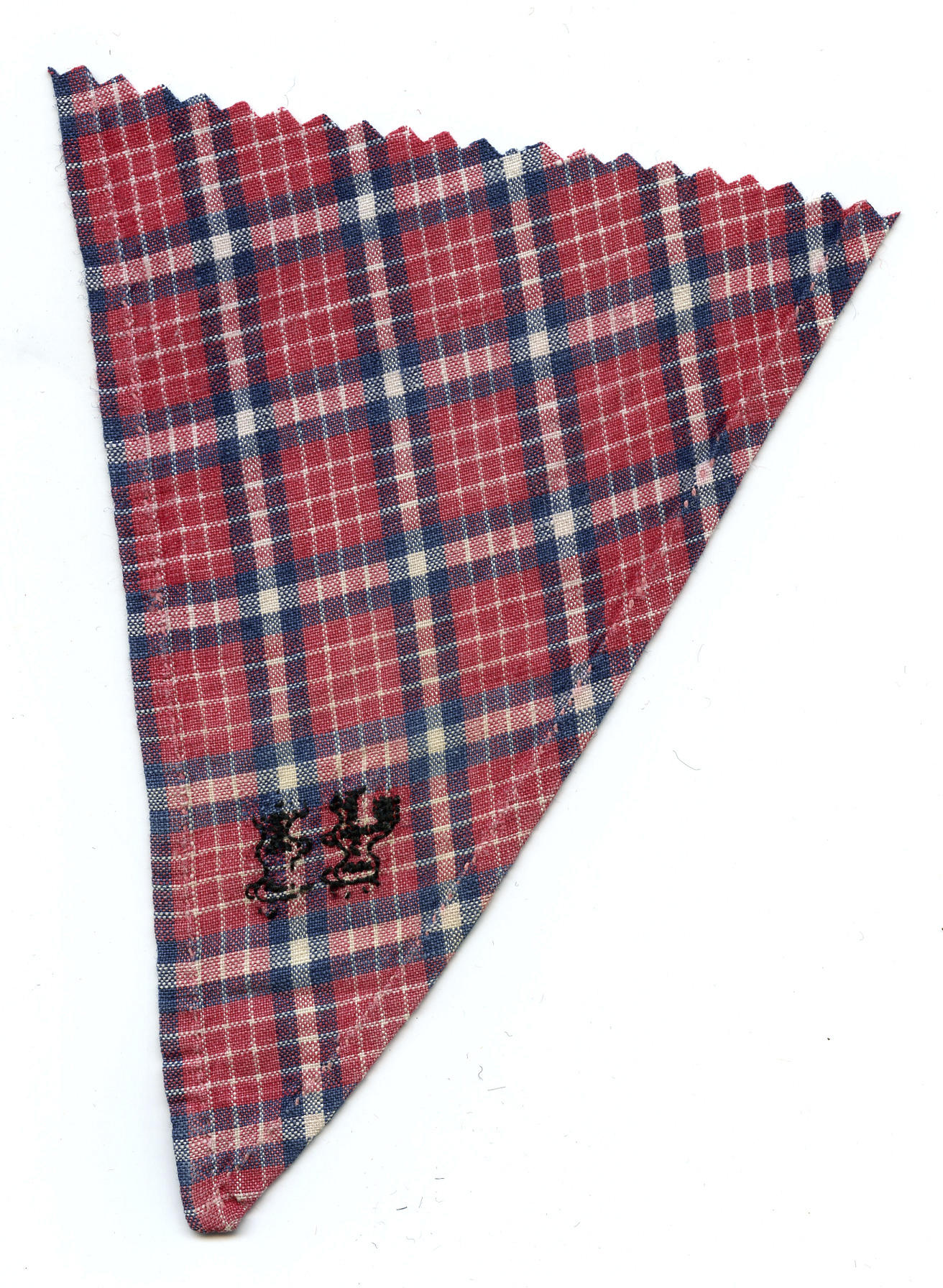 Fragment van een halsdoek van geruite katoen, gedragen door een man of jongen in Marker streekdracht. In de punt zijn de initialen 'IP' geborduurd met zwart garen. De zomen zijn met de hand gezoomd.