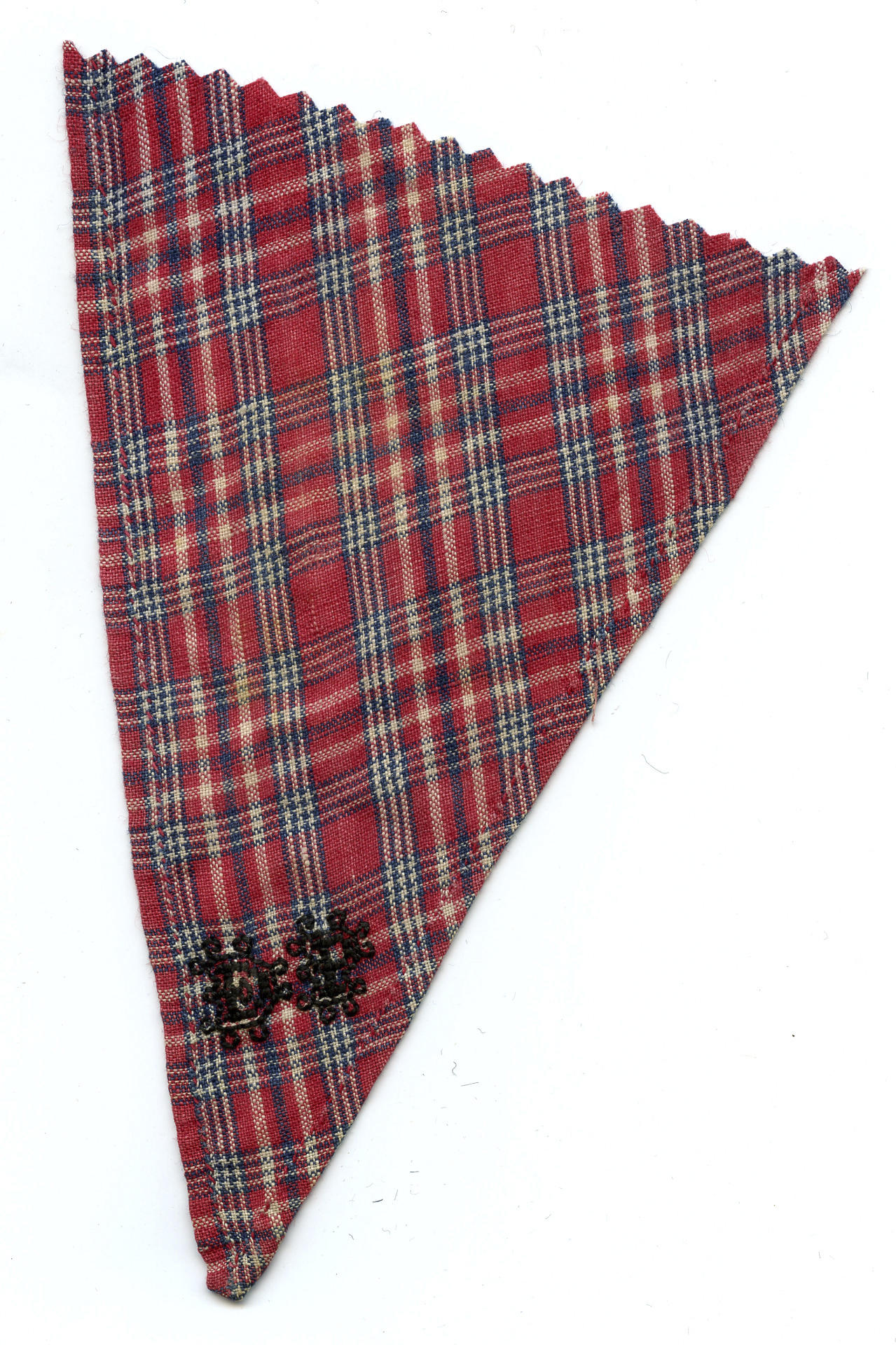 Fragment van een halsdoek van geruite katoen, gedragen door een man of jongen in Marker streekdracht. In de punt zijn de initialen 'DP' geborduurd met zwart garen. De zomen zijn met de hand gezoomd.