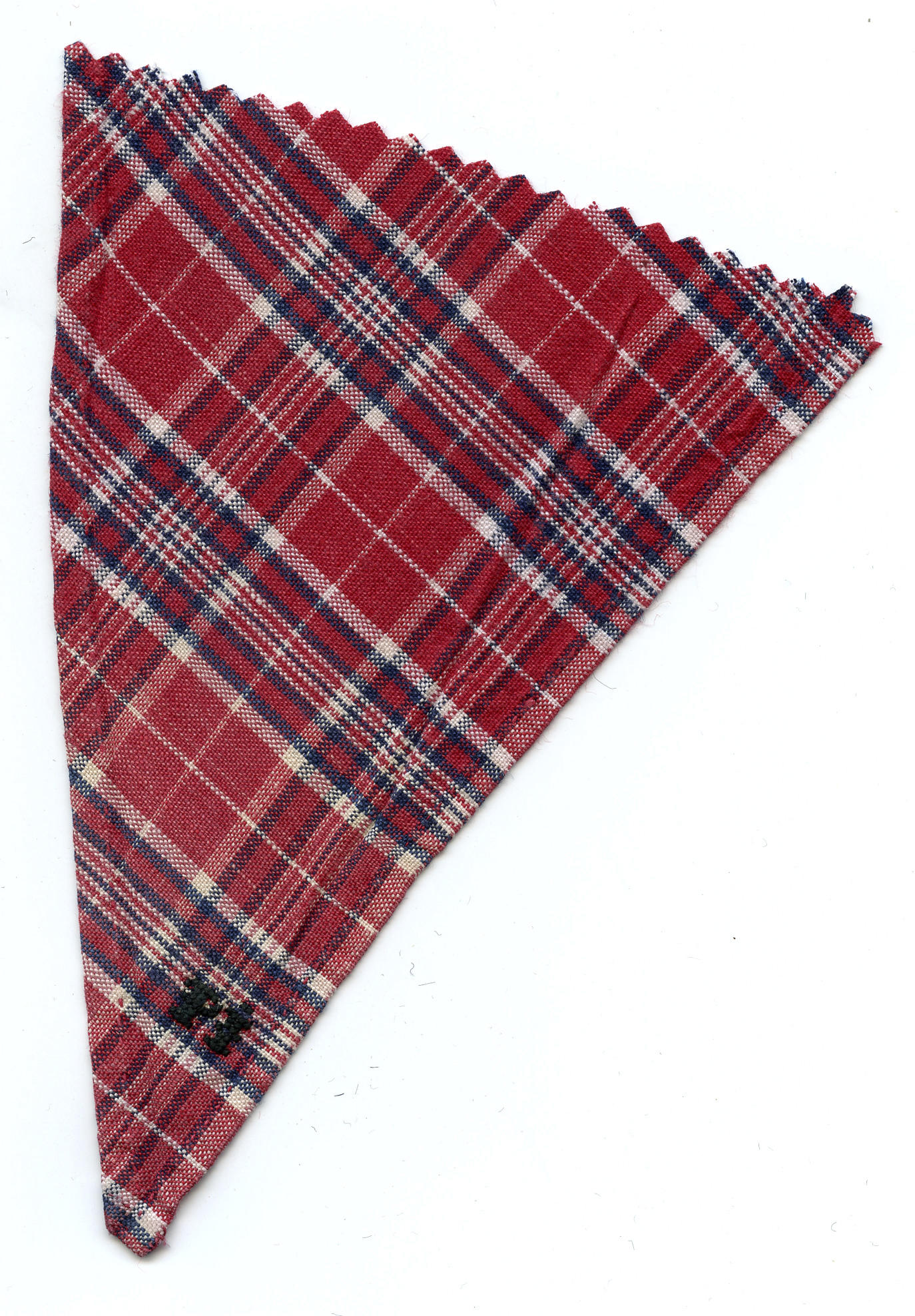 Fragment van een halsdoek van geruite katoen, gedragen door een man of jongen in Marker streekdracht. In de punt zijn de initialen 'PI' geborduurd met zwart garen. De zomen zijn met de hand gezoomd.