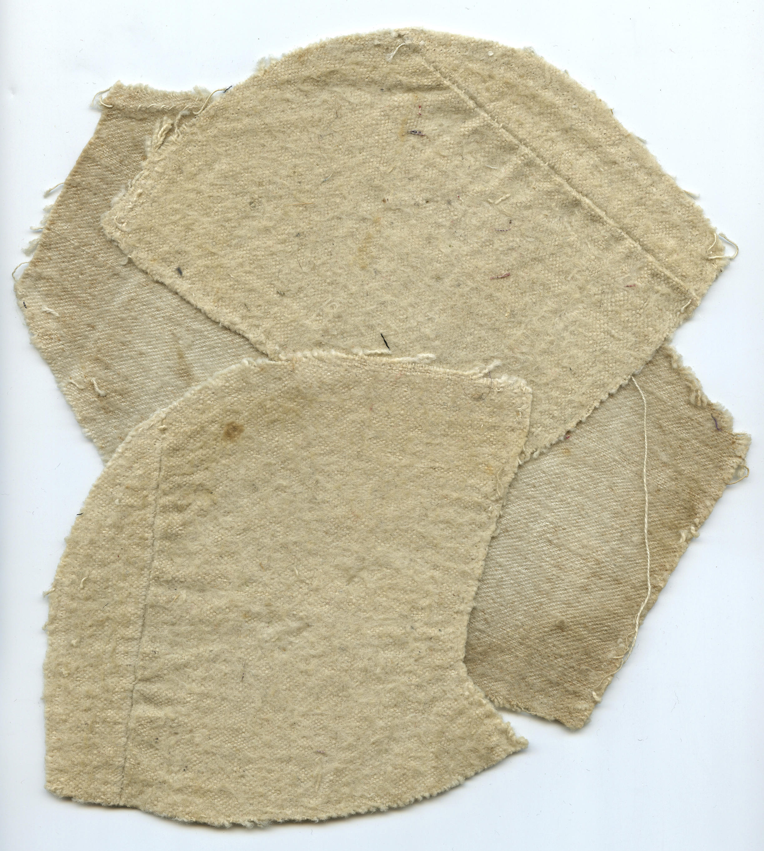 Patroondelen van een Marker meisjesmuts: de losgetornde voering, twee zijstukken en een middendeel.