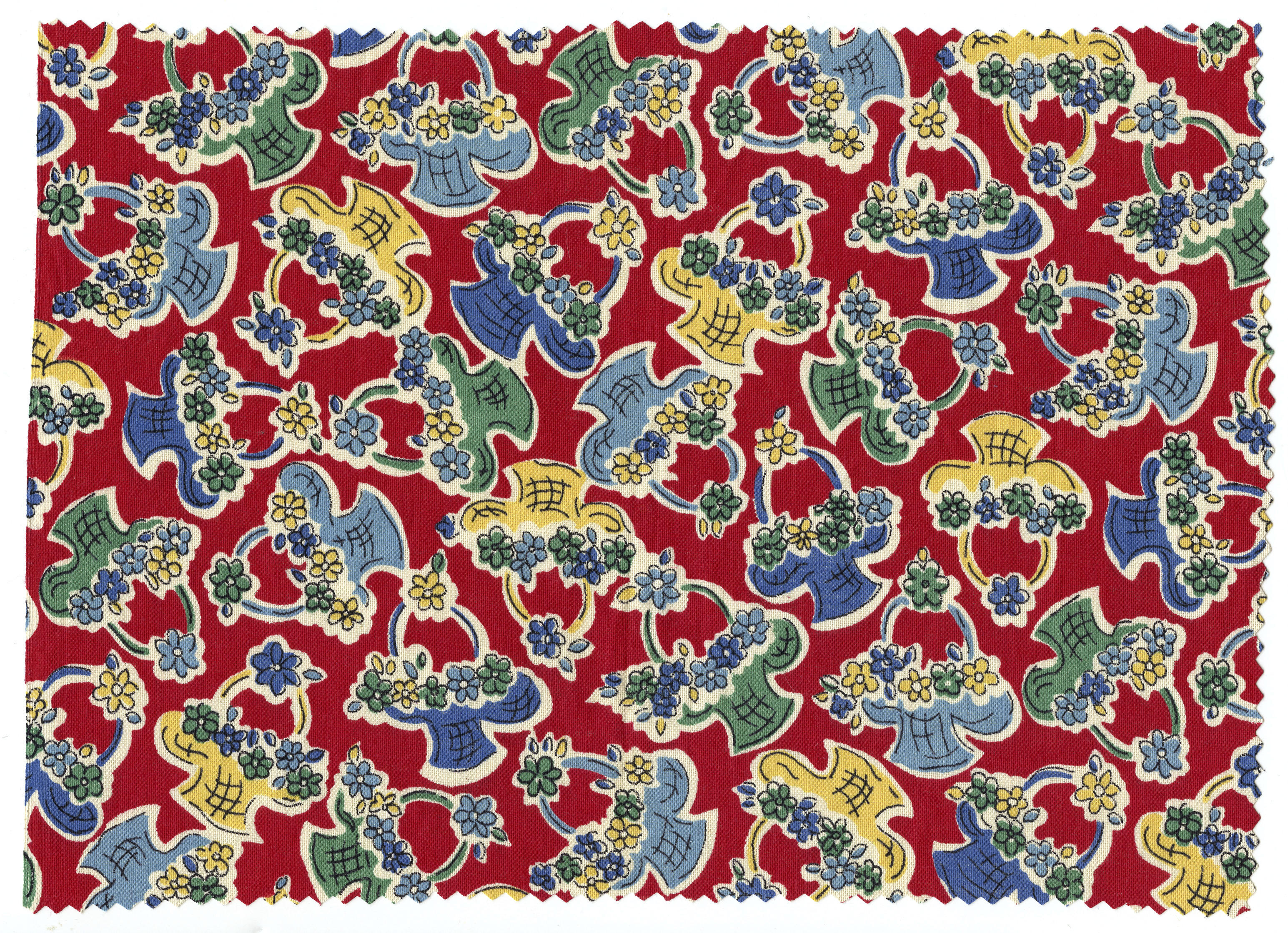 Fragment van een borstlap, een zogenoemde baaf of bauw, gedragen door een meisje of vrouw in Marker streekdracht bij de doordeweekse dracht. De katoenen stof is bedrukt met een meerkleurig dessin van bloemenmandjes op een rood fond.