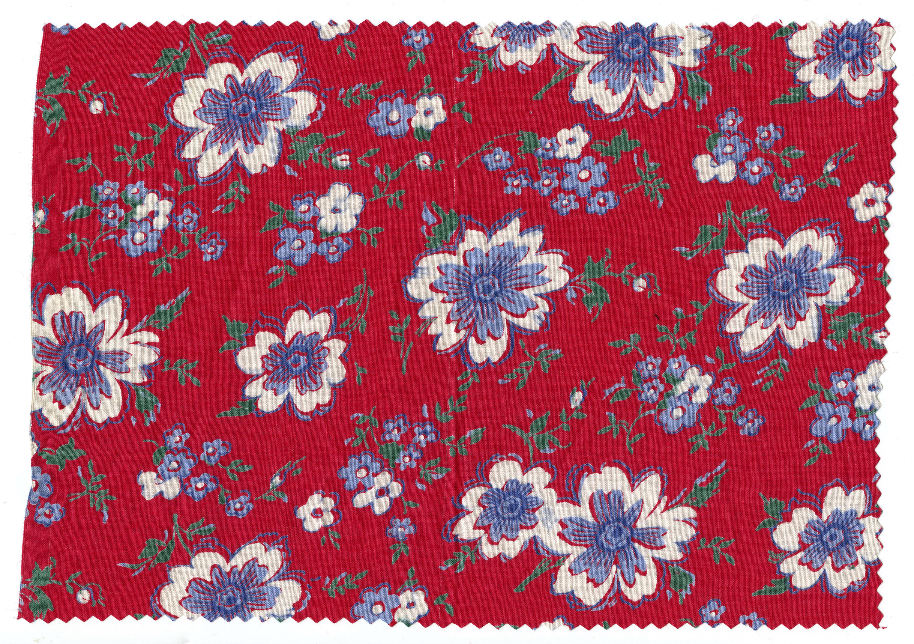 Fragment van een borstlap, een zogenoemde baaf of bauw, gedragen door een meisje of vrouw in Marker streekdracht bij de doordeweekse dracht. De katoenen stof is bedrukt met een meerkleurig floraal dessin op een rood fond.