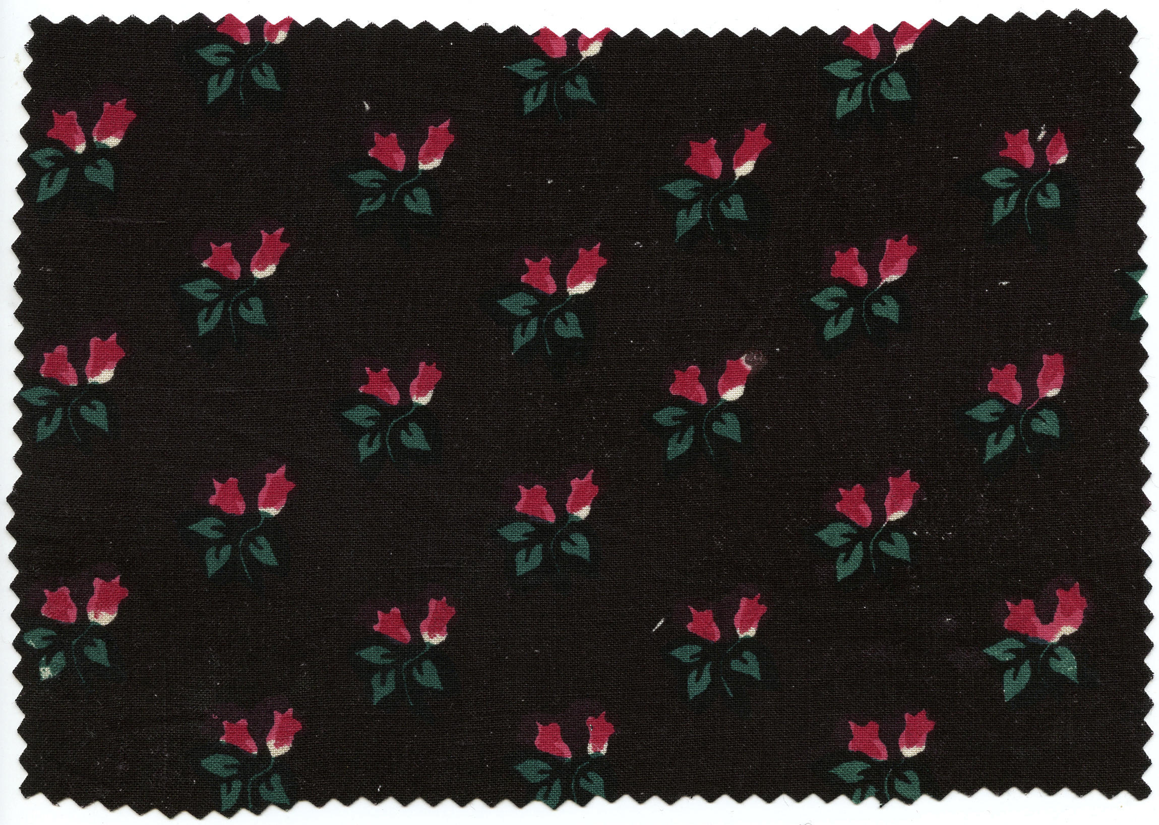 Gedessineerde katoen, zogenoemd brung, gebruikt voor vrouwenjakken in Bunschoten-Spakenburg. De stof is geweven in platbinding en bedrukt met rode en groene motiefjes op een bruin fond.