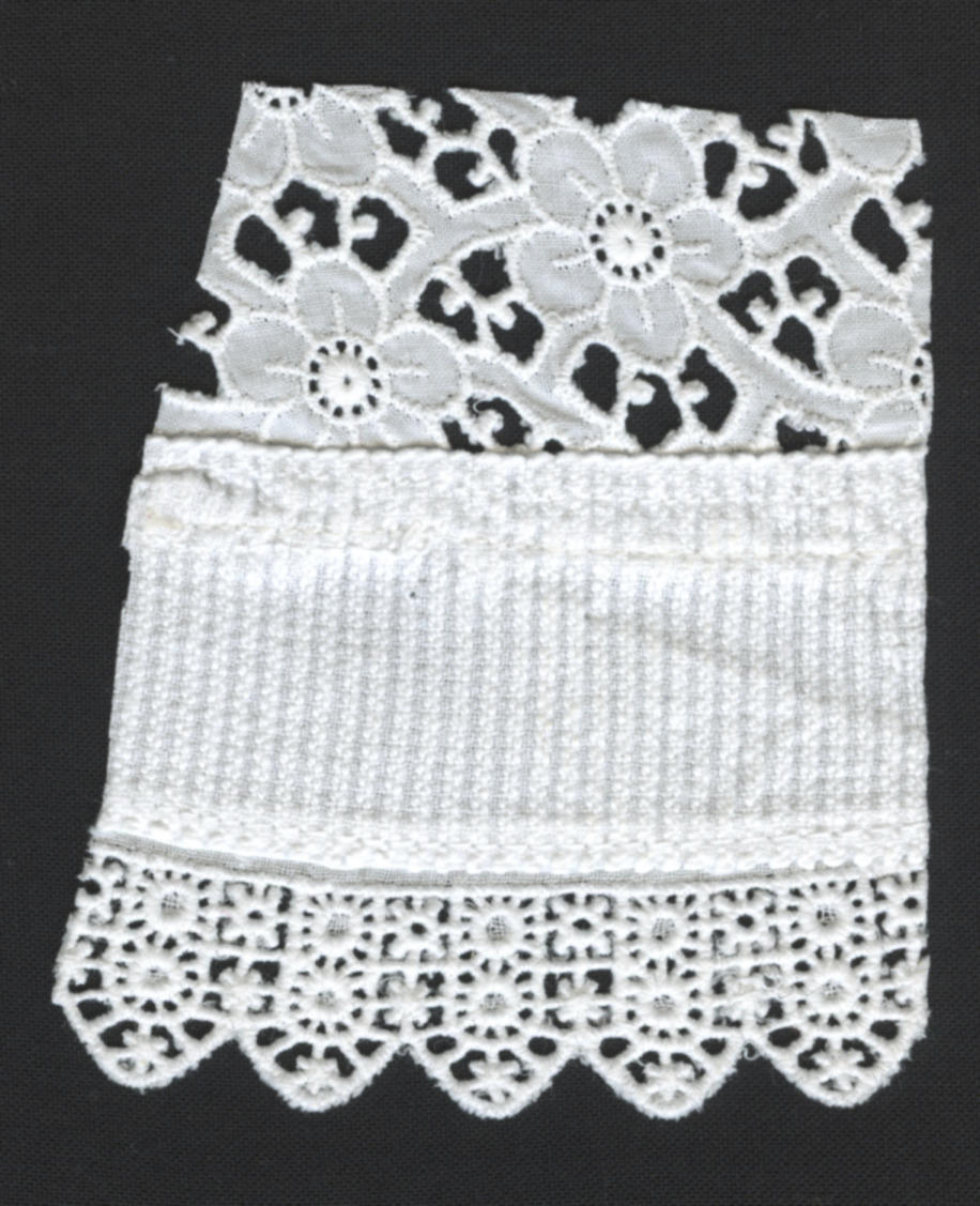 Fragment van een witte katoenen ondermuts, gedragen door een vrouw of meisje in streekdracht uit Arnemuiden. Aan de bol van machinale broderie is langet van 3,3 centimeter breed gezet, met daarlangs een gepunt festonrandje.
