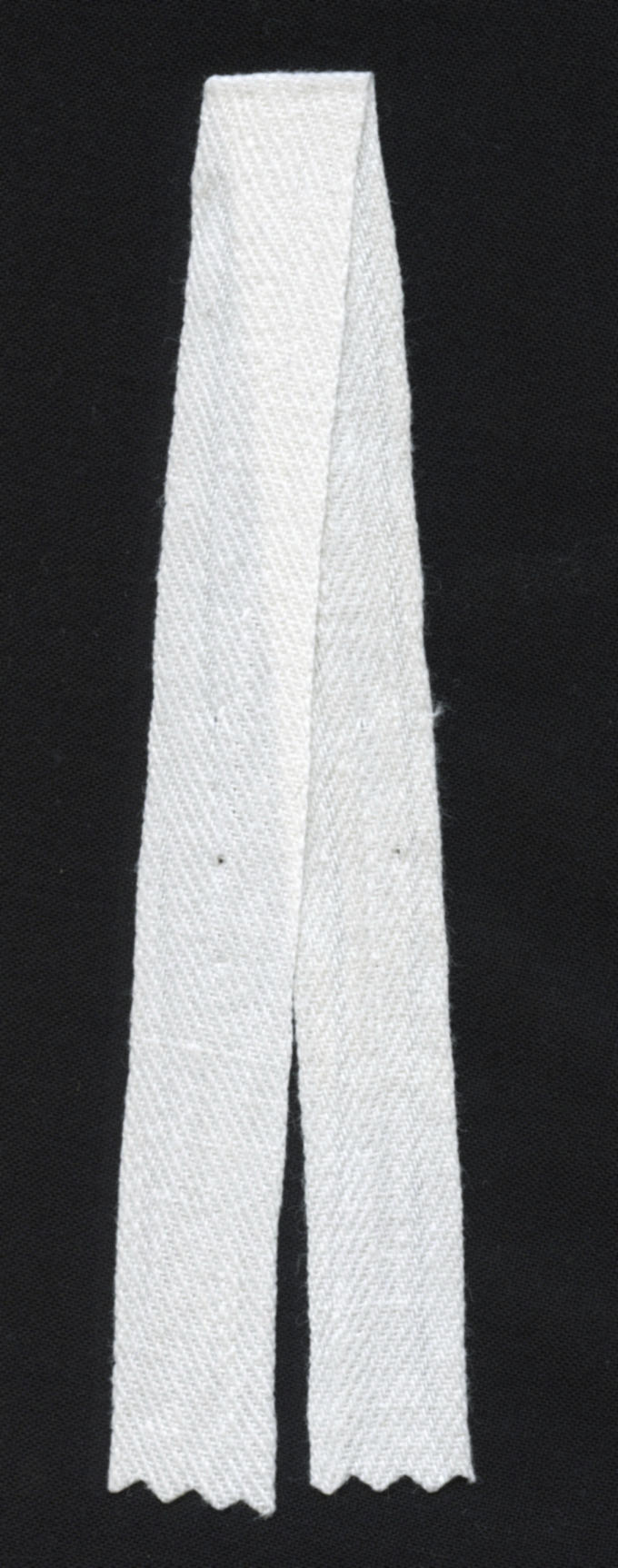 Wit katoenen keperband, gebruikt door vrouwen en meisjes in Walcherse streekdracht voor onder meer de sluiting van de ondermuts, meisjesmuts, 'beuk' (kroplap) en 'keuszak' (dijzak).