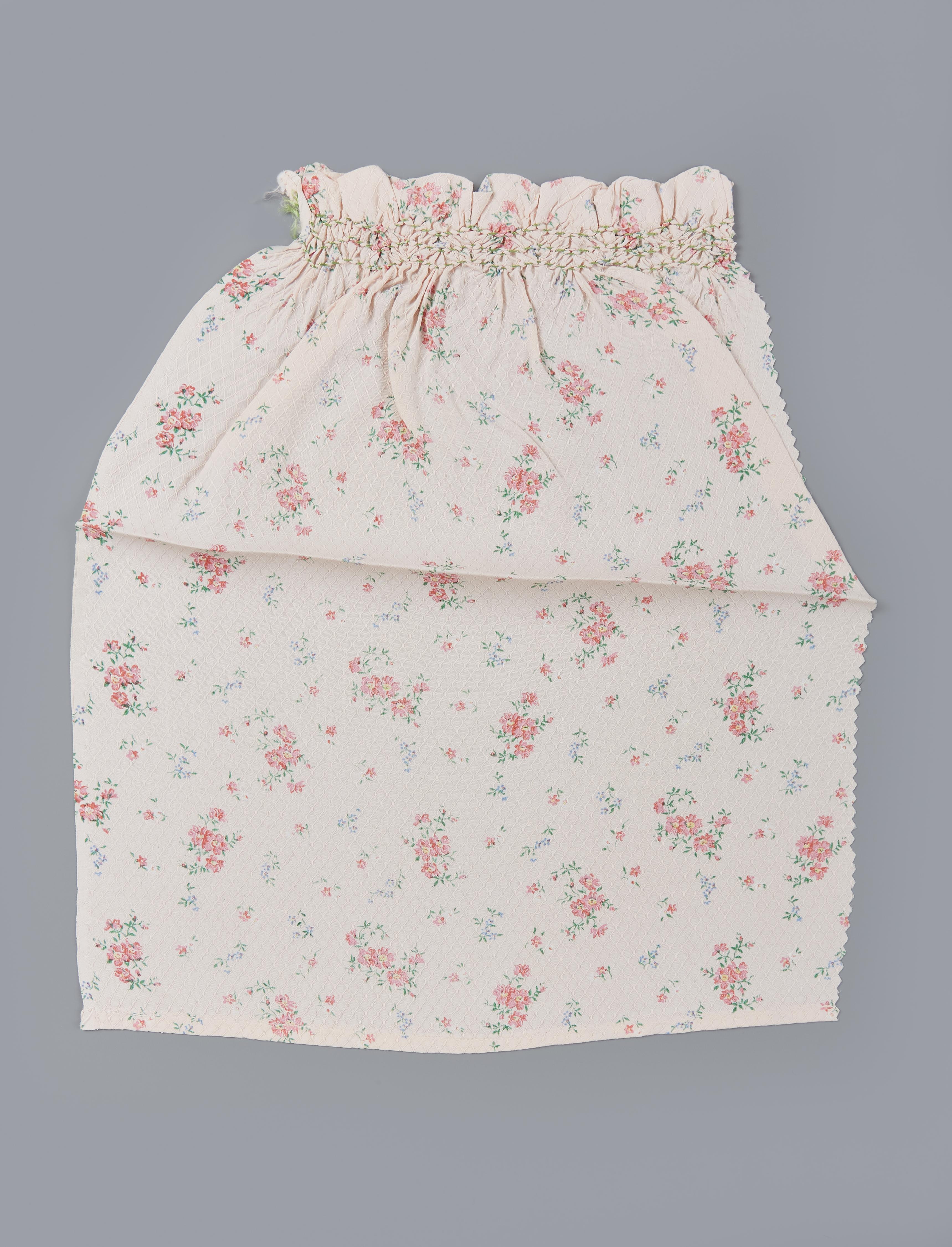 Fragment van een voorpand van een zogenoemde beuk (kroplap), gedragen door een vrouw in Walcherse streekdracht. Langs de hals is de stof opgerimpeld en zijn de plooitjes met groen garen vastgezet. Onderlangs is het voorpand machinaal gezoomd. Het fragment is gemaakt van kunstvezel met een ingeweven reliëf. De roze ondergrond is bedrukt met kleine bloemmotieven. ...