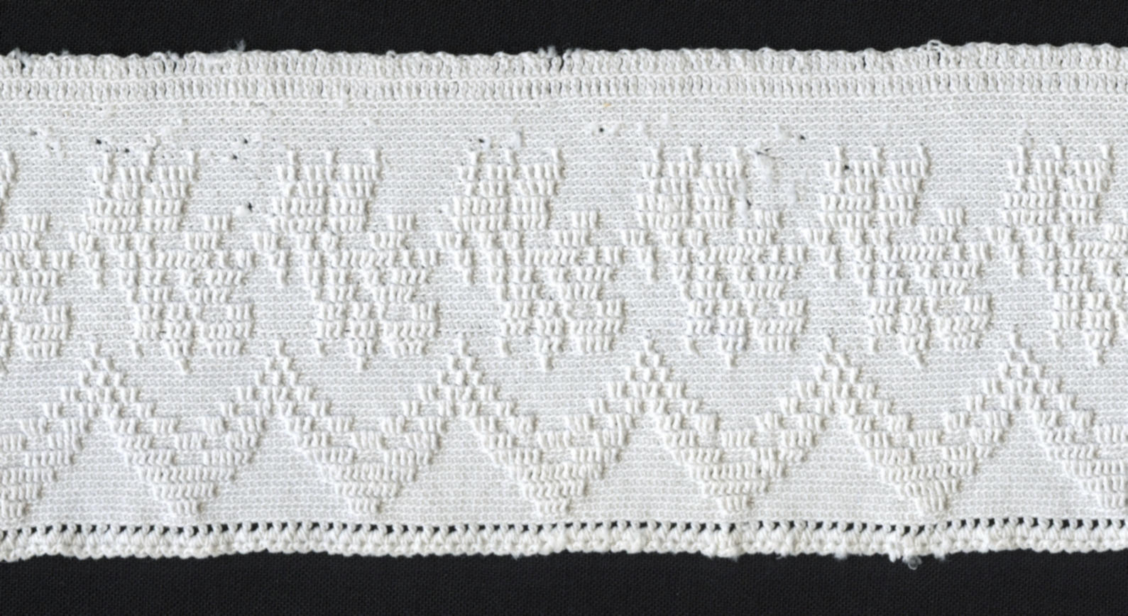 Gehaakte sierstrook, afkomstig van een witte katoenen ondermuts die gedragen werd door een vrouw in streekdracht uit de provincie Friesland, Groningen of Drenthe. Deze strook zat aan de achterzijde van de muts.