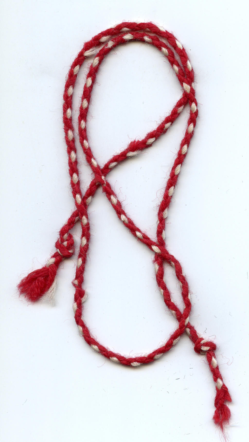 Stukje gevlochten wollen koord. Dergelijk koord werd op Urk gebruikt als afwerking aan de gekleurde onderrok. Het koord bestaat uit drie rode draden en een witte draad.