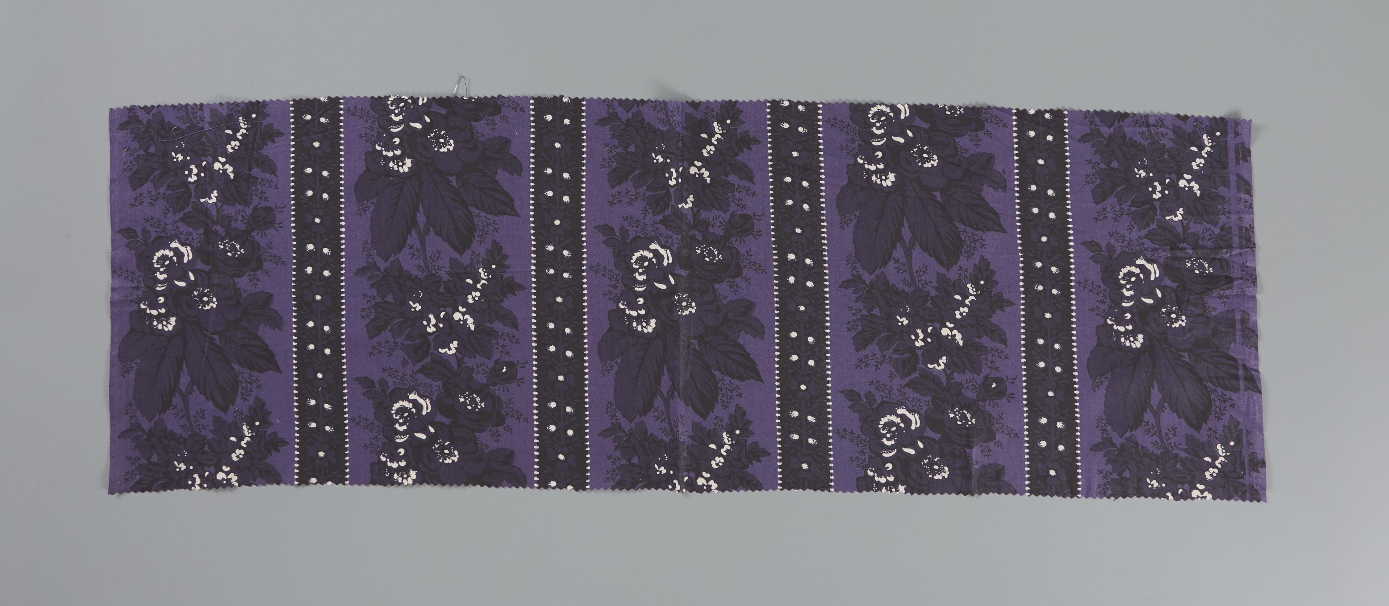 Strook bedrukte katoen. Deze stof werd gebruikt voor voor kraplappen in Bunschoten en Spakenburg. Deze kleurencombinatie was geschikt voor de zogenoemde vierljaarsrouw. De weefbreedte is 79 centimeter.