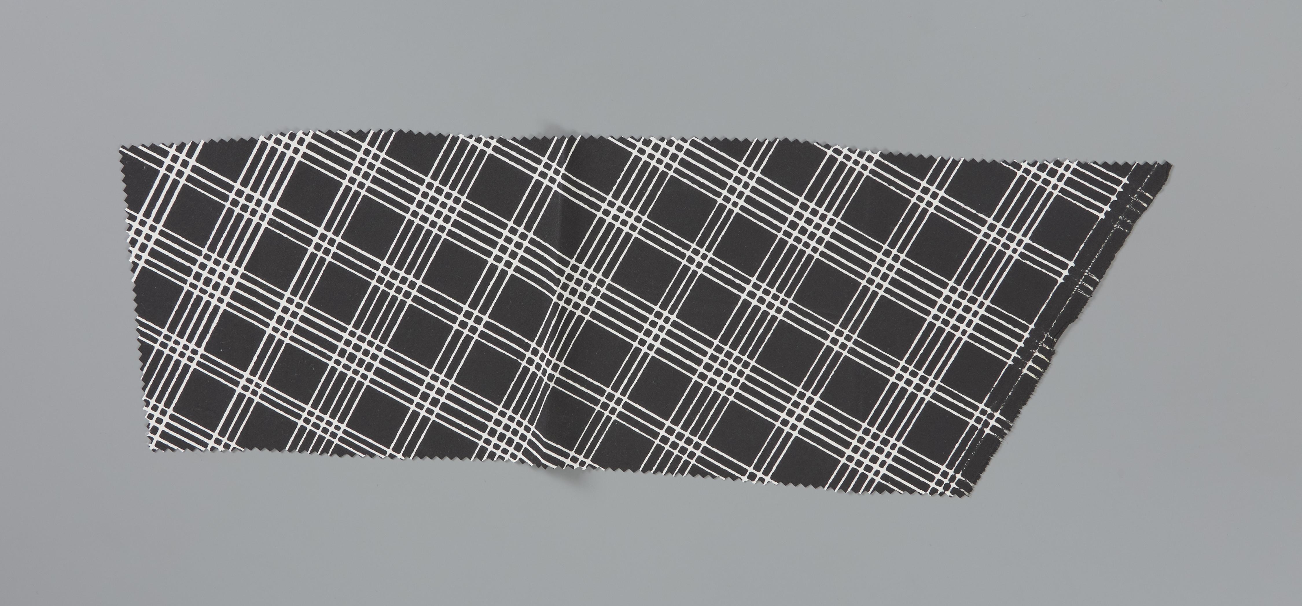 Fragment van een geruite katoenen schouderdoek, gedragen in Bunschoten en Spakenburg bij de rouwdracht. De katoenen stof is geweven in platbinding. Hij is bedrukt met een ruitmotief, waarbij witte ruiten zijn uitgespaard in een zwart fond. Het fragment is schuin uit de stof geknipt, voor het maken van een achterdoek. Deze rouwdoeken zijn pas vanaf ...