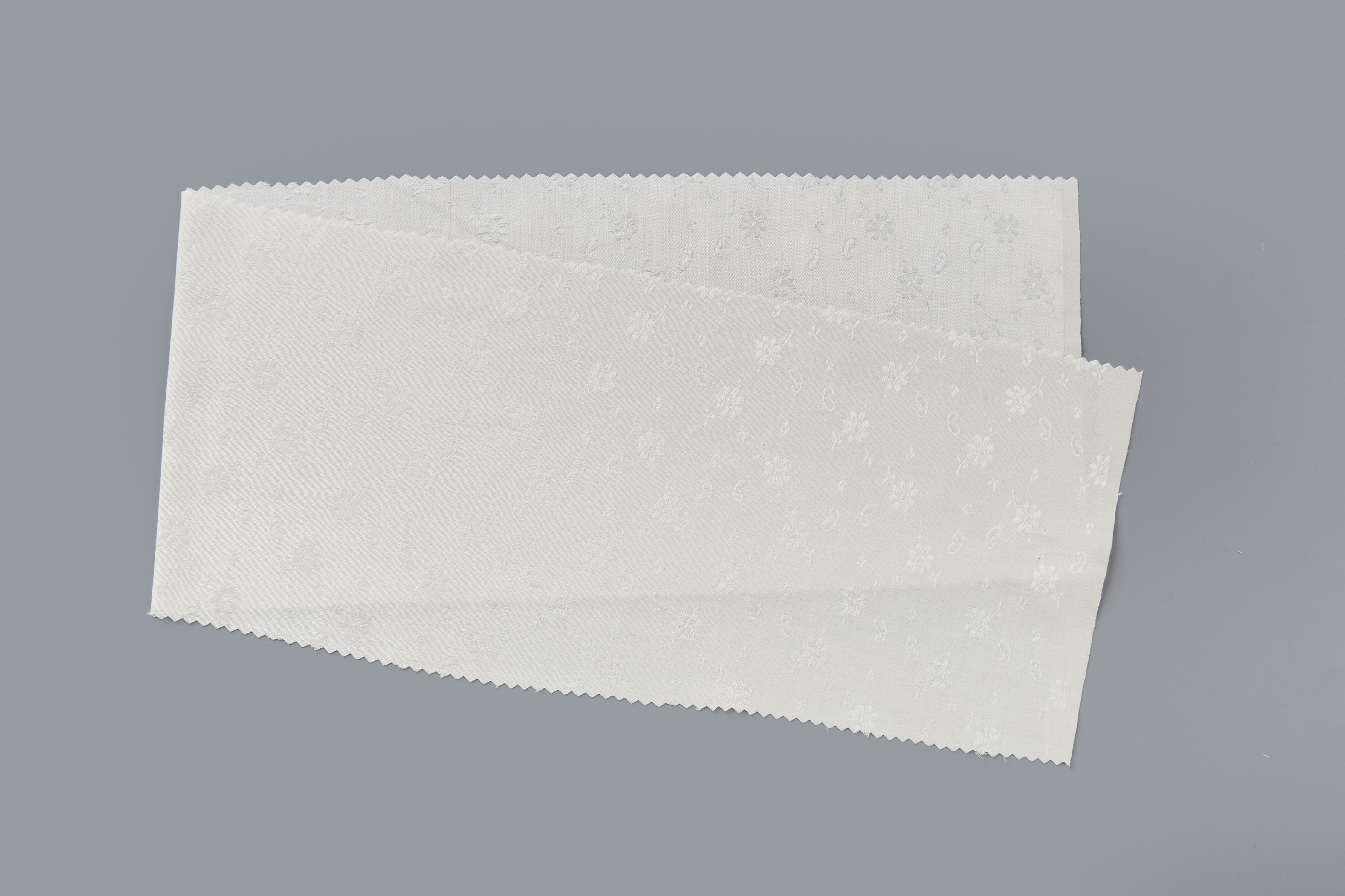 Crèmekleurige katoenen satijn met ingeweven bloemmotieven. De stof heeft een weefbreedte van 69 centimeter.