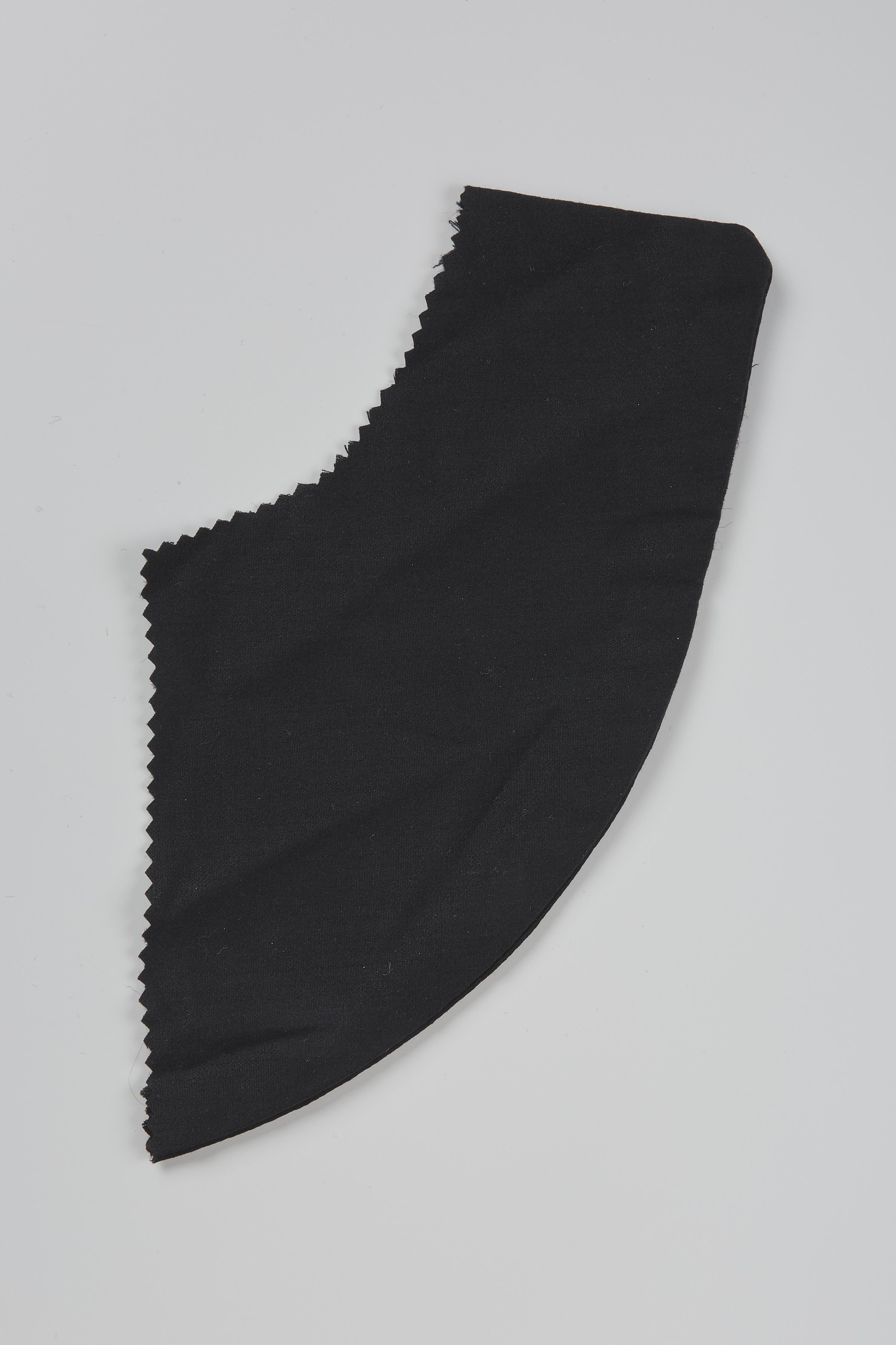Een fragment van een kraag van een jak, gedragen door een vrouw in streekdracht uit Huizen. De kraag is van fijne zwarte wol. Deze fijngeweven zwarte stof wordt in Huizen 'tibee' genoemd. Tussen de boven- en onderkant van de kraag zit een passepoil van dezelfde stof, in Huizen 'koordlapje' genoemd. In de ronding van het ...