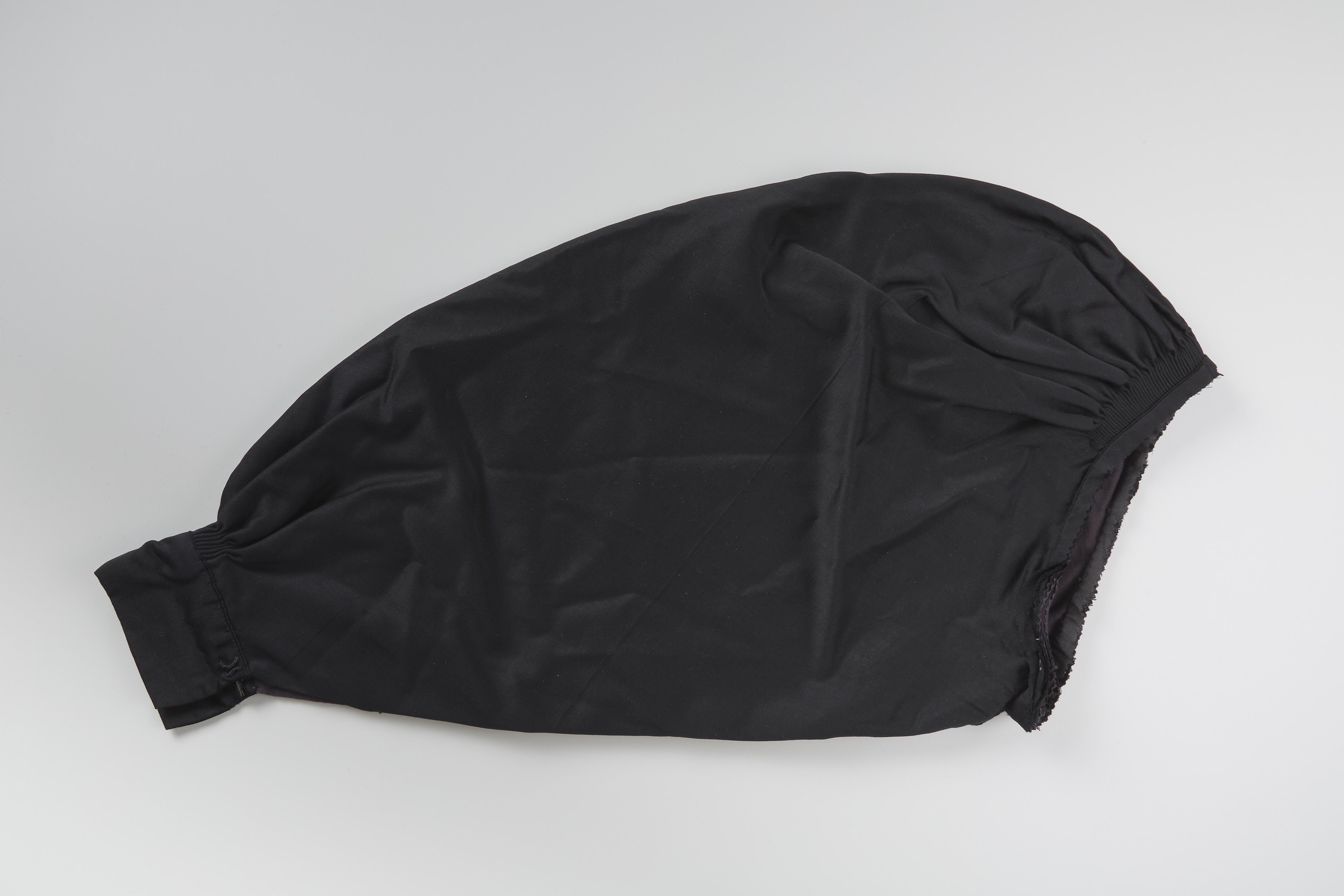 Mouw, geknipt uit een zwart wollen jak, gedragen door een vrouw in streekdracht uit Huizen. Deze fijngeweven zwarte stof wordt in Huizen 'tibee' genoemd. Het jak is gevoerd met paarse keperkatoen. De feitelijke mouw en de mouwvoering bestaan beide uit één patroondeel. Beide delen zijn afzonderlijk dubbelgevouwen en op elkaar gelegd, waarna de zijnaad in ...