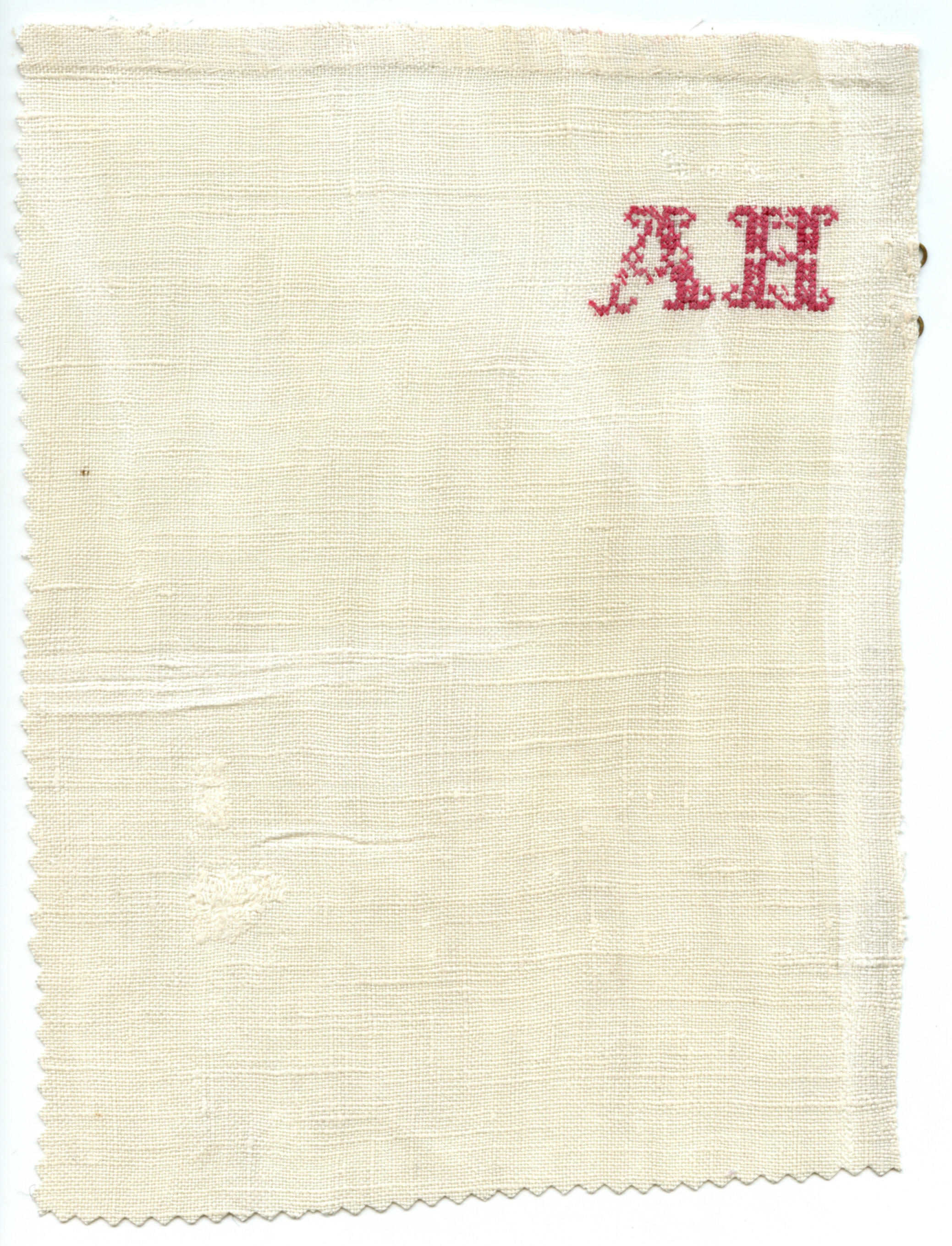 Fragment van een witte linnen boezel, gedragen door een vrouw in streekdracht van Marken. In het linnen schortdeel zijn met rood garen de initialen AH in kruissteek geborduurd. Aan de achterzijde, tegen de rand van de boezel, zijn twee messing oogjes genaaid voor bevestiging van de schortbanden.
