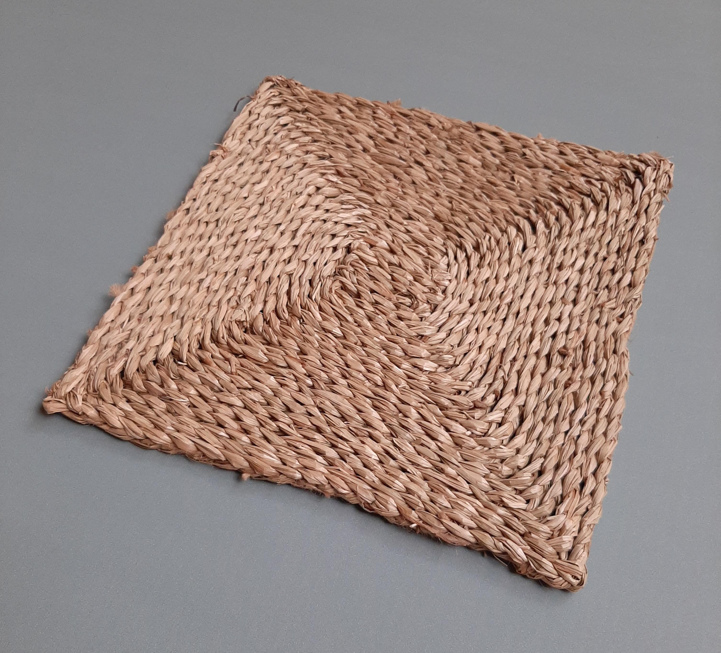 Biezen tegel van 30 bij 30 centimeter. De tegel bestaat uit van biezen gevlochten banden die met juten garen zijn vastgenaaid.