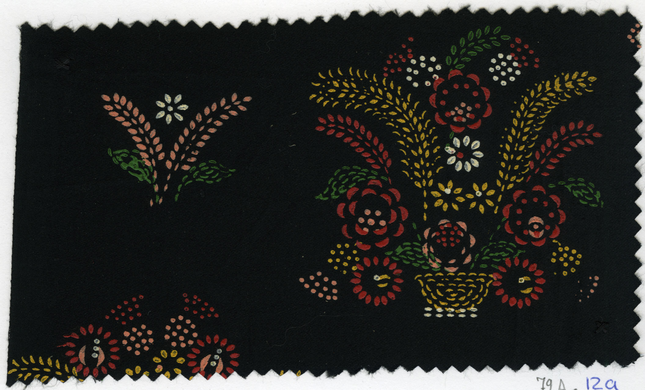 Stuk zwart satijn met een meerkleurig stipwerkdessin. De motieven zijn kleur voor kleur op de stof aangebracht met behulp van drukblokken. Deze stof werd onder meer gebruikt voor kinderkleding, doordeweekse mutsen en kraplappen in de Staphorster dracht.