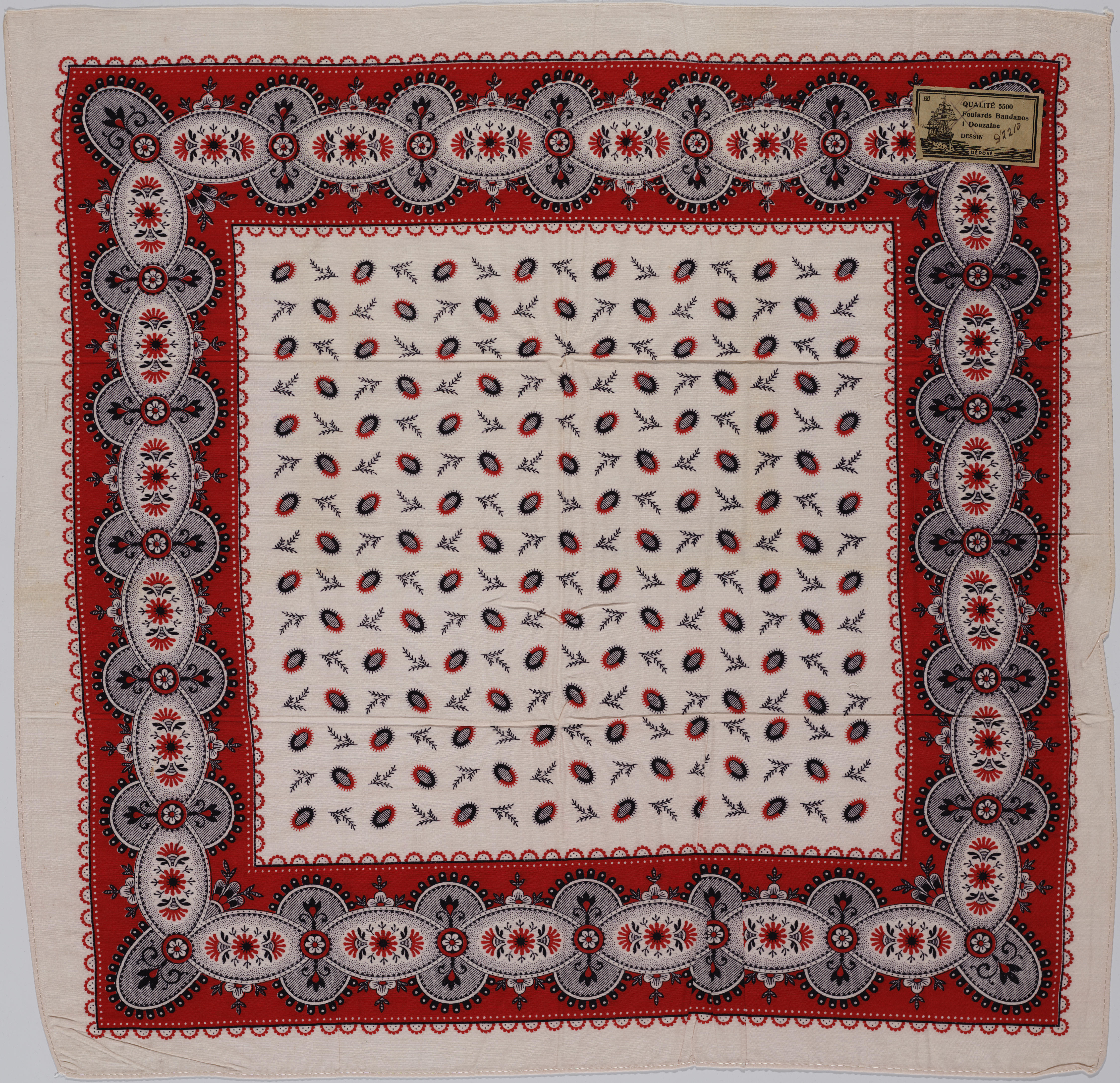 Witte katoenen zakdoek met een opgedrukt dessin in rood en zwart, gebruikt door mannen in Staphorst en Rouveen op zondag en bij speciale gelegenheden. Op de zakdoek is een label geplakt met daarop de Franse tekst: ‘Qualité 5500/Foulards Bandanos/1 Douzaine/Dessin/Déposé’.