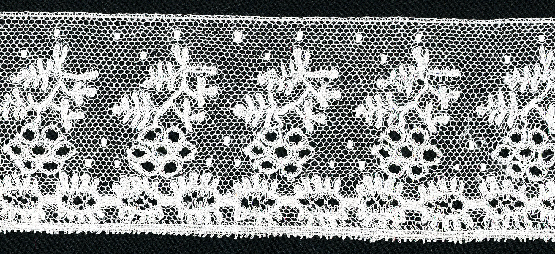 Een strook Rijselse kloskant, geklost met doorlopende draden. De motieven hebben een contourdraad en zijn geklost in linnenslag. In de ovale motieven langs de rand is een siergrond toegepast. Het rapport is circa 3,5 centimeter. Dit type kloskant komt voor aan verschillende soorten streekdrachtmutsen.