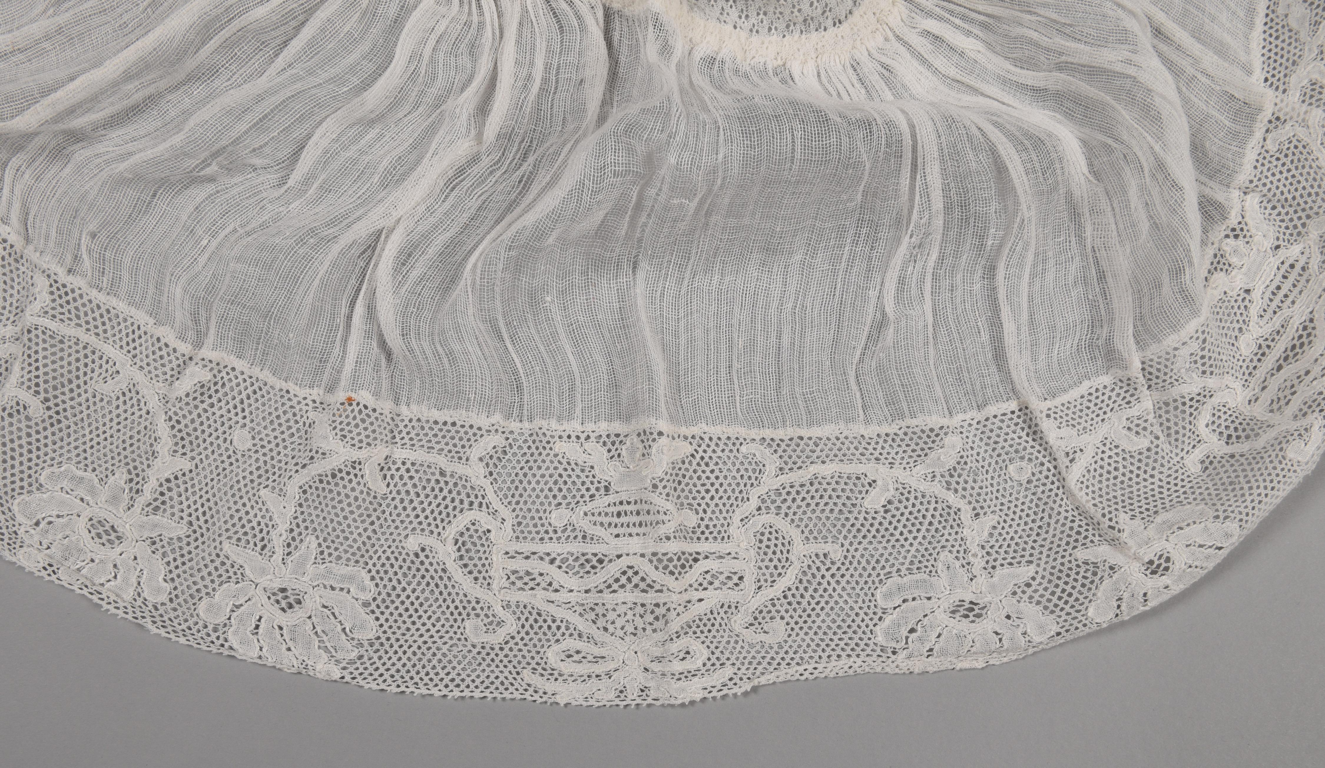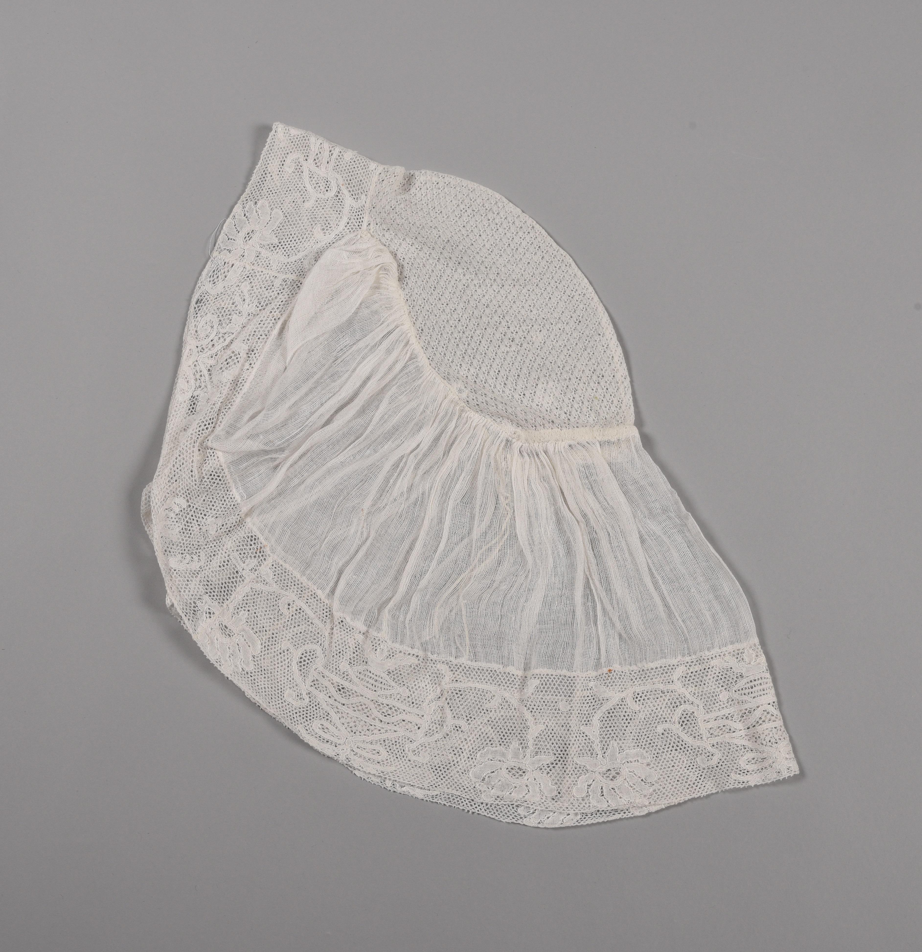 Een oorijzermuts, een zogenoemde ‘floddermuts’, of ook wel ‘oortjesmuts’ genoemd. De muts is gedragen door een vrouw in Friese streekdracht. De muts heeft een bol van een wit open weefsel of machinaal breisel, een afhangende strook van wit mutsengaas en rondom een kantstrook van Vlaamse kloskant. De kant is geklost met doorlopende draden en heeft ...