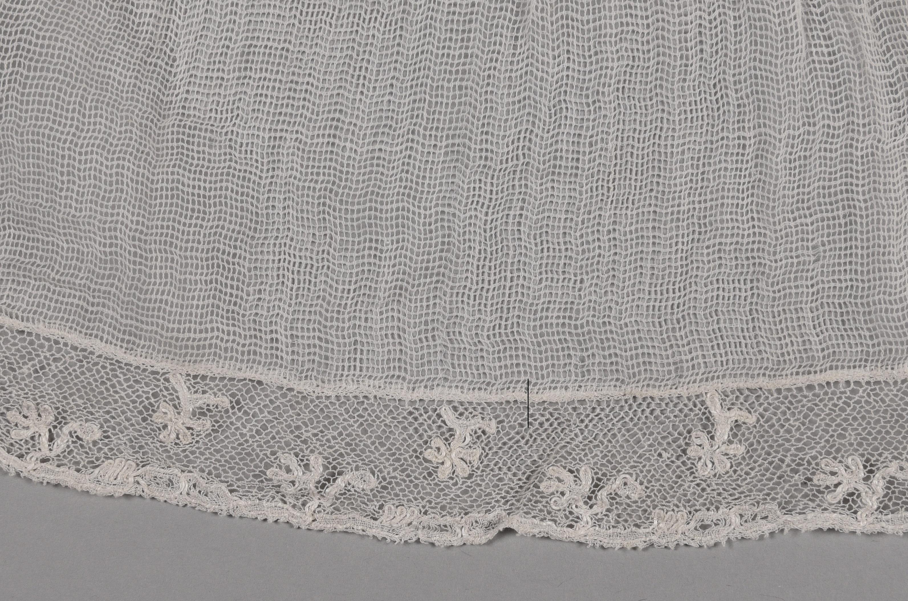 Een oorijzermuts, een zogenoemde ‘floddermuts’, of ook wel ‘oortjesmuts’ genoemd. De muts is gedragen door een vrouw in Friese streekdracht. De muts heeft een bol van een wit open weefsel, een afhangende strook van wit mutsengaas en rondom een kantstrook van Rijselse kloskant. De kantstrook is circa 2,5 centimeter breed en heeft een rapport van ...