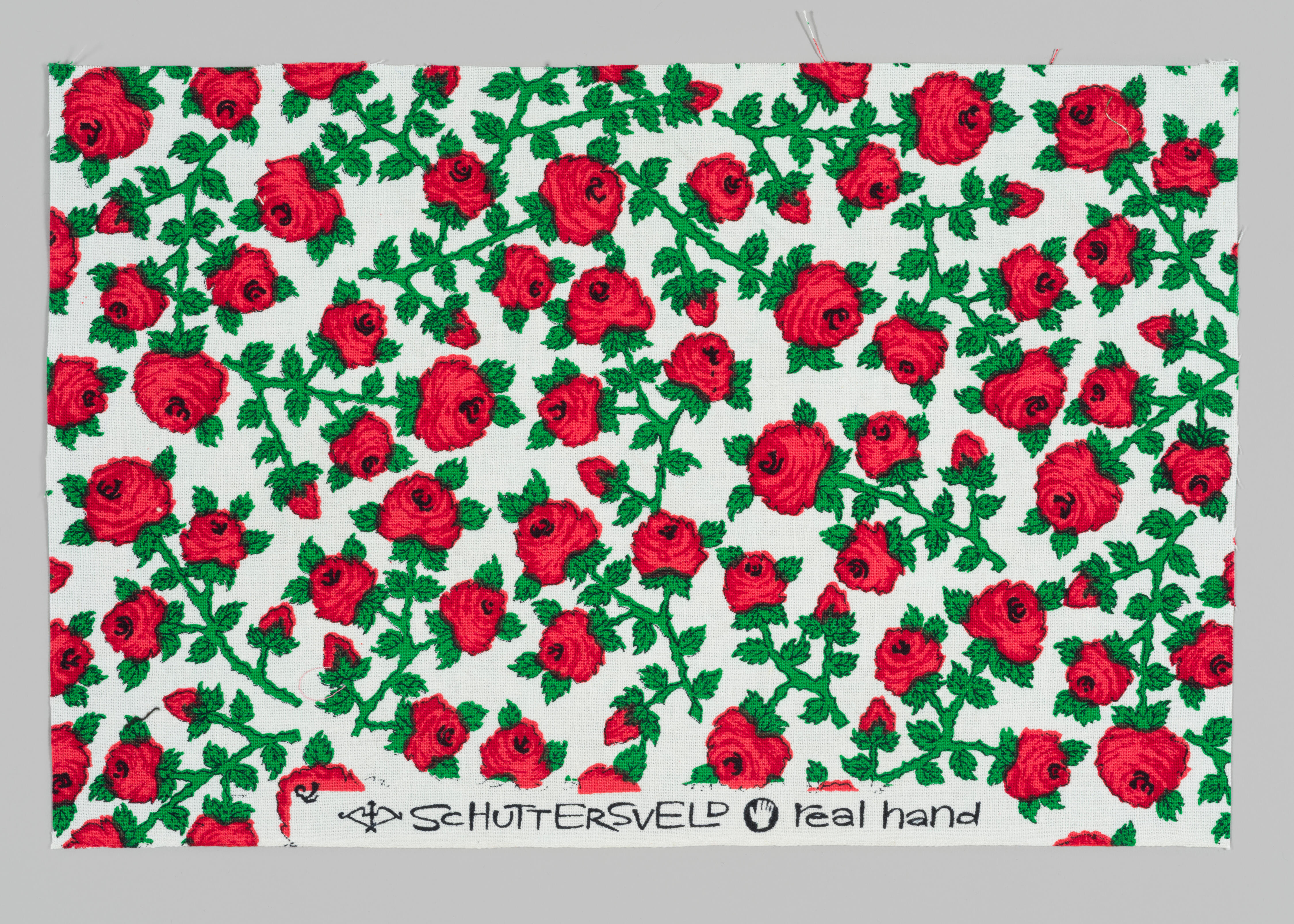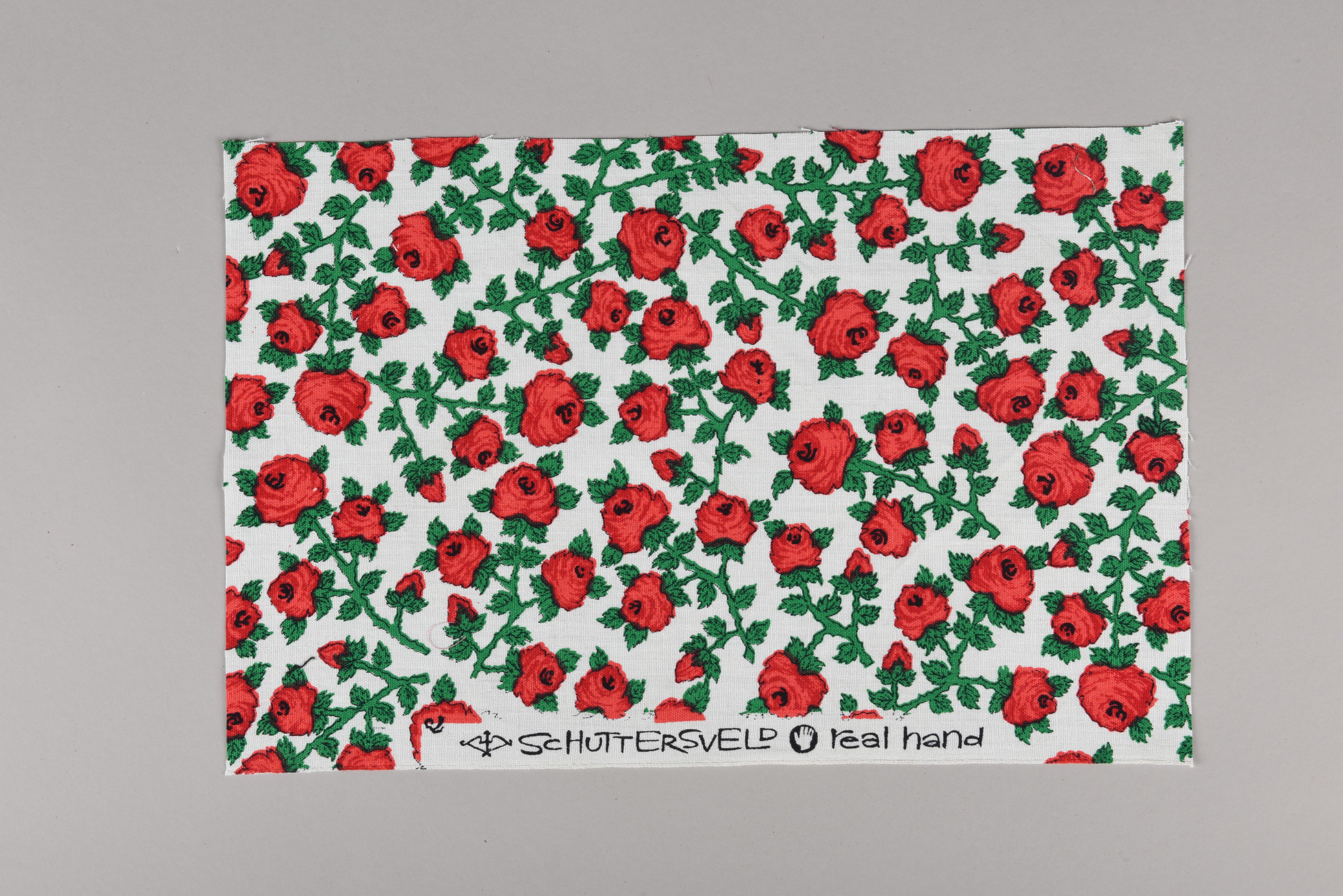 Een stuk witte katoenen stof, geweven in platbinding en bedrukt met een rood-groen-zwart dessin. Op de zelfkant is de tekst 'Schuttersveld real hand' gedrukt.