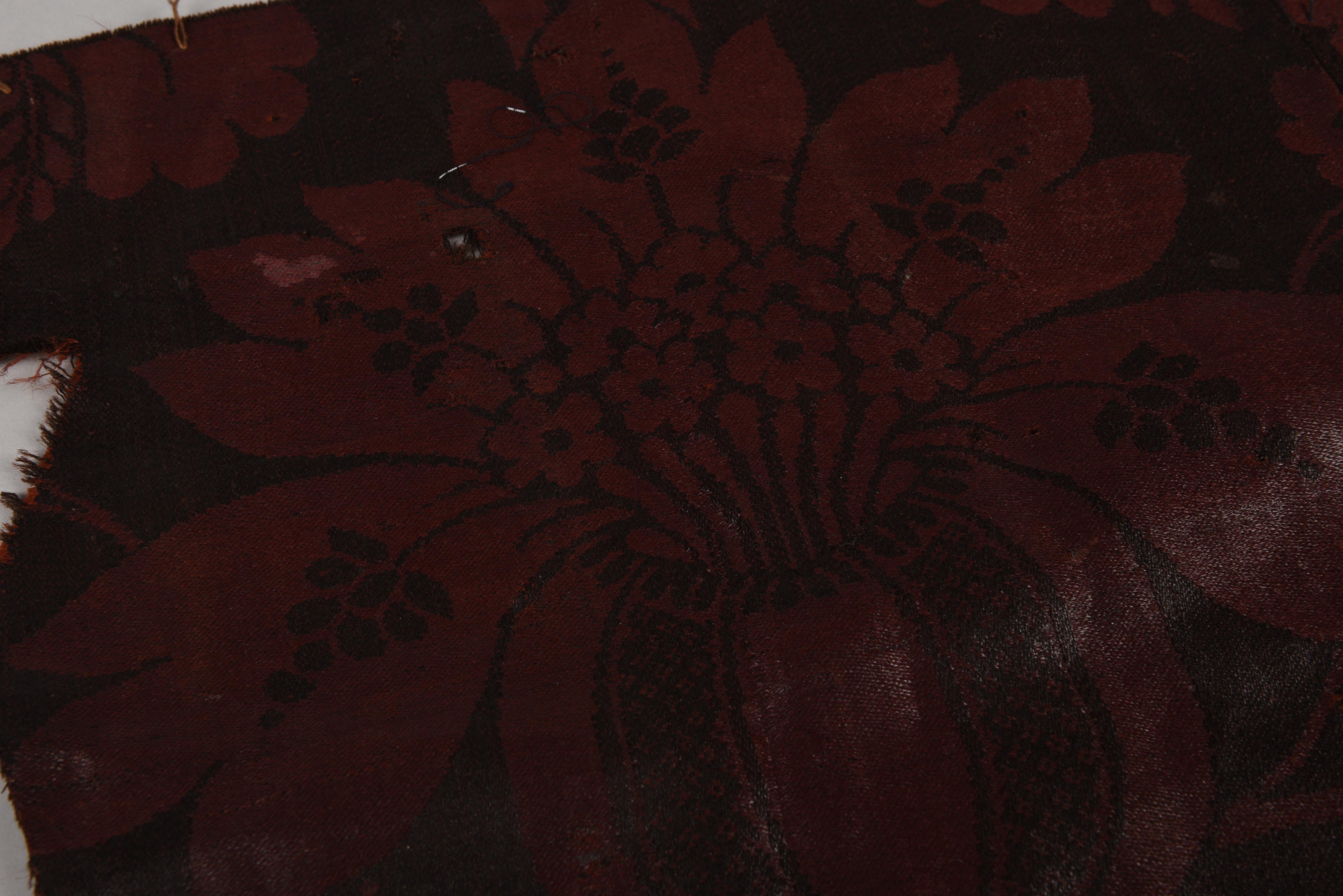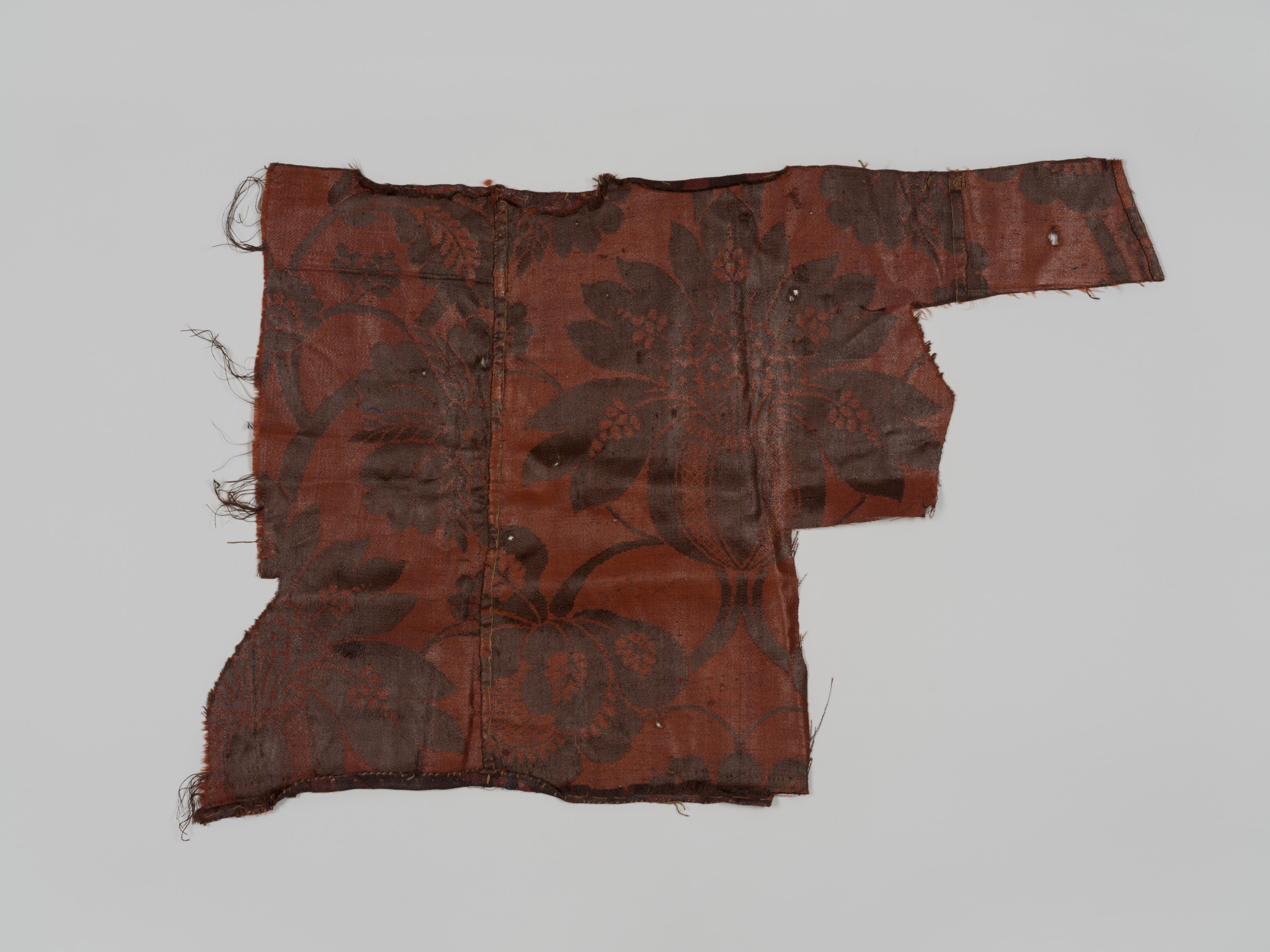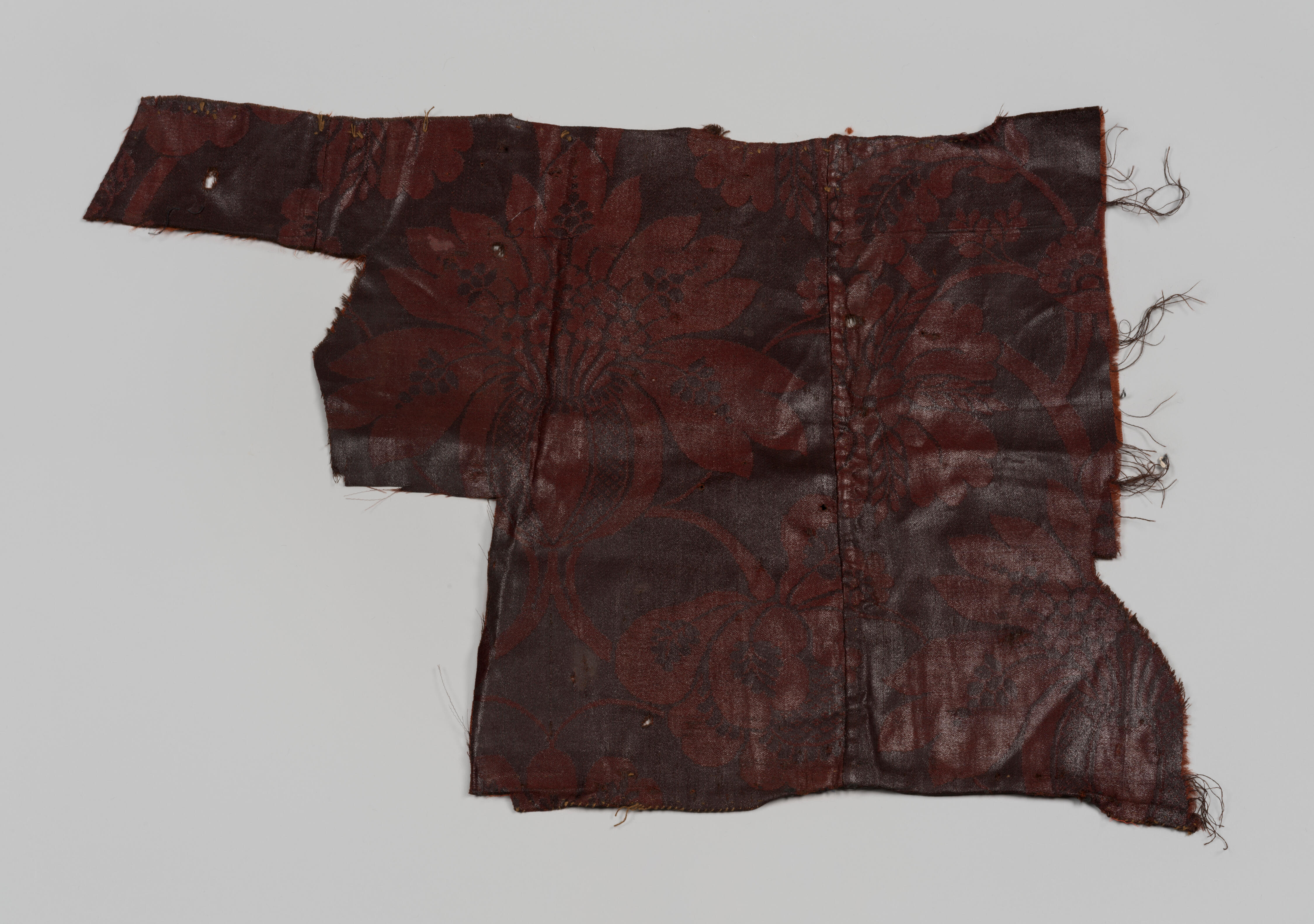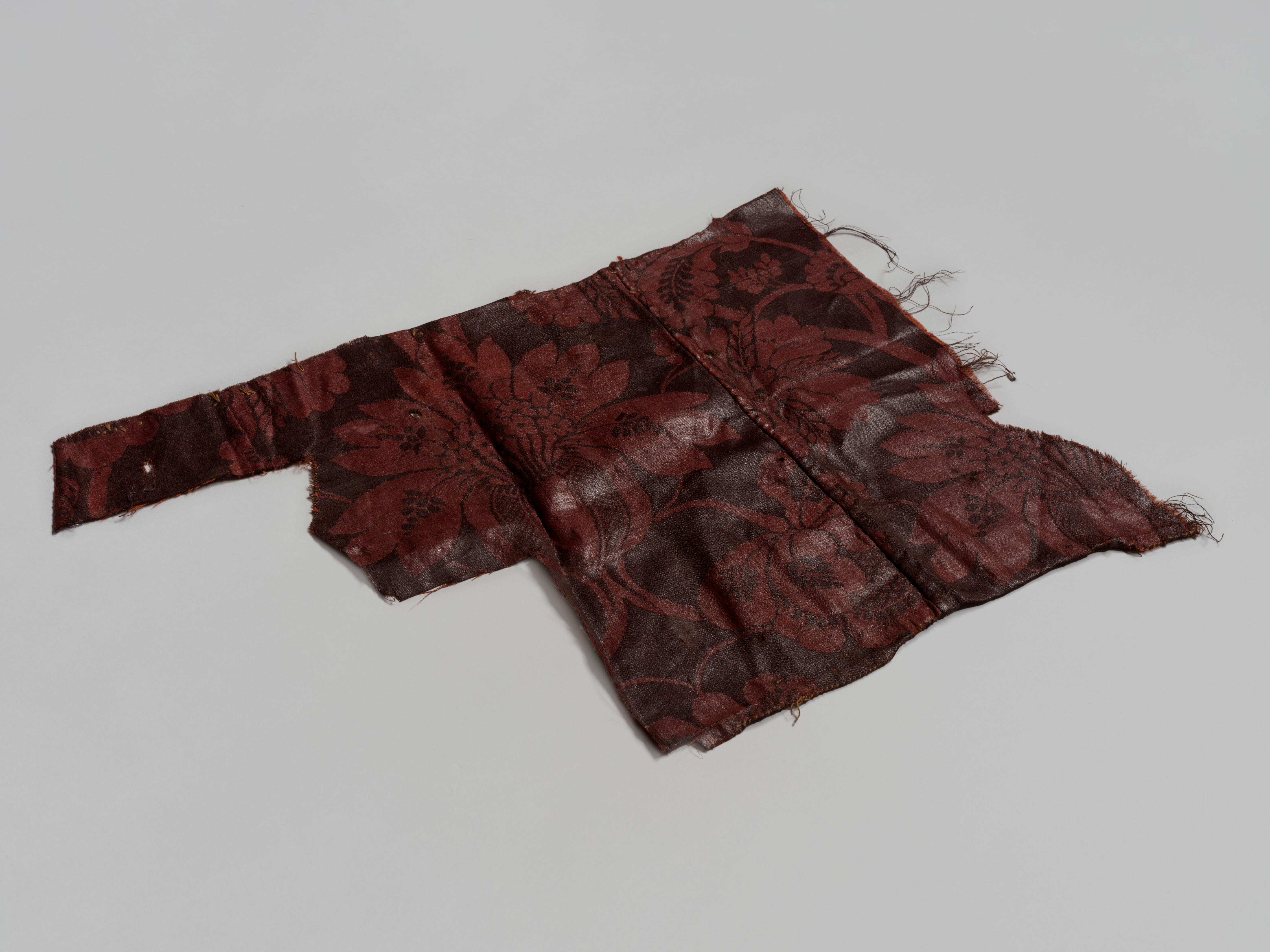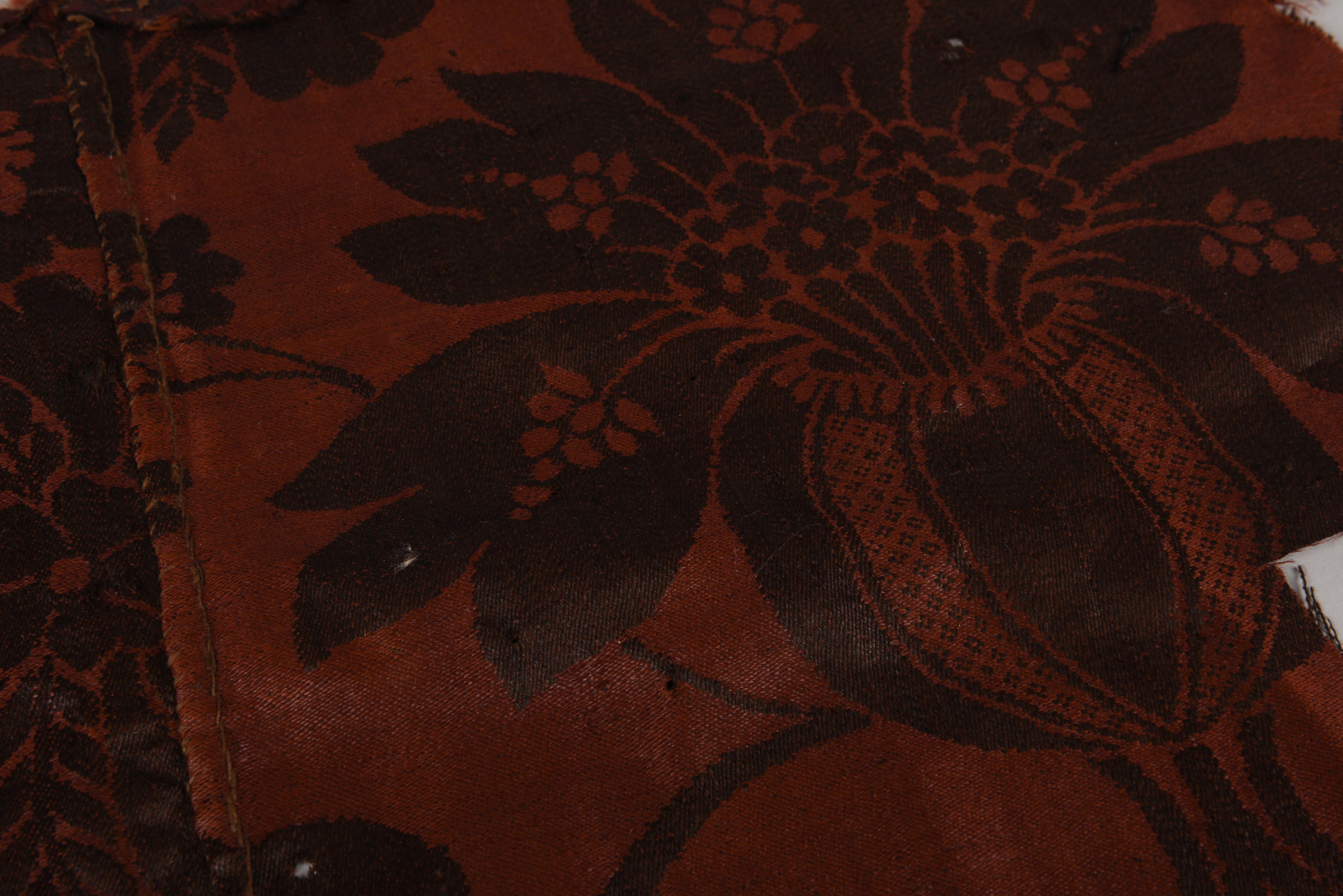 Een fragment van een kledingstuk, gemaakt van bruine wollen damast. Mogelijk gaat het hier om een gedeelte van een rugpand van een hemdrok. Het dessin heeft een groot rapport en bestaat uit lichtbruine motieven op een donkerder bruin fond. Het oppervlak is sterk geglansd. Dit soort wollen damast werd geweven in Norwich, Engeland, vanaf circa ...