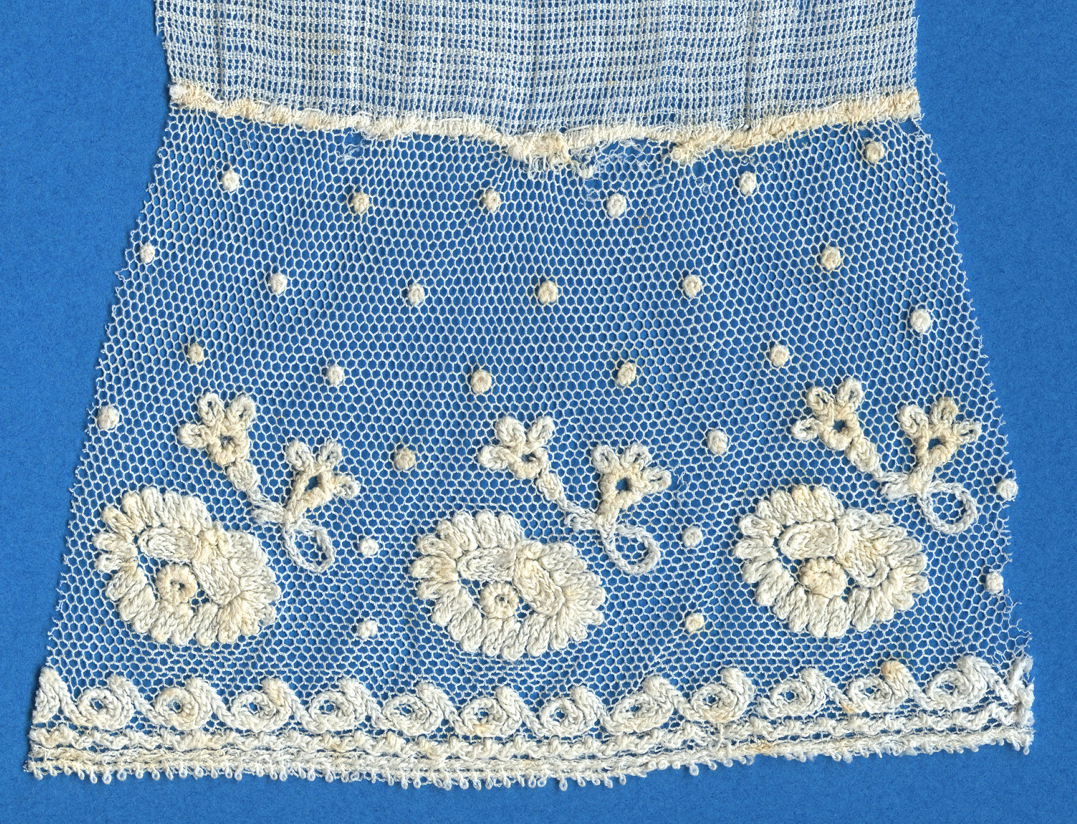 Fragment van een strook getamboereerde tule aan een strook mutsengaas, gedragen aan de voorstrook van een 'isabee' door een vrouw uit Huizen. De isabee is de doordeweekse muts bij de oorijzerdracht. Dit soort kant werd ter plaatse 'uurlingskant' genoemd. Het fragment is verworven door museummedewerkers tijdens veldwerk in Huizen in 1944 of 1945.