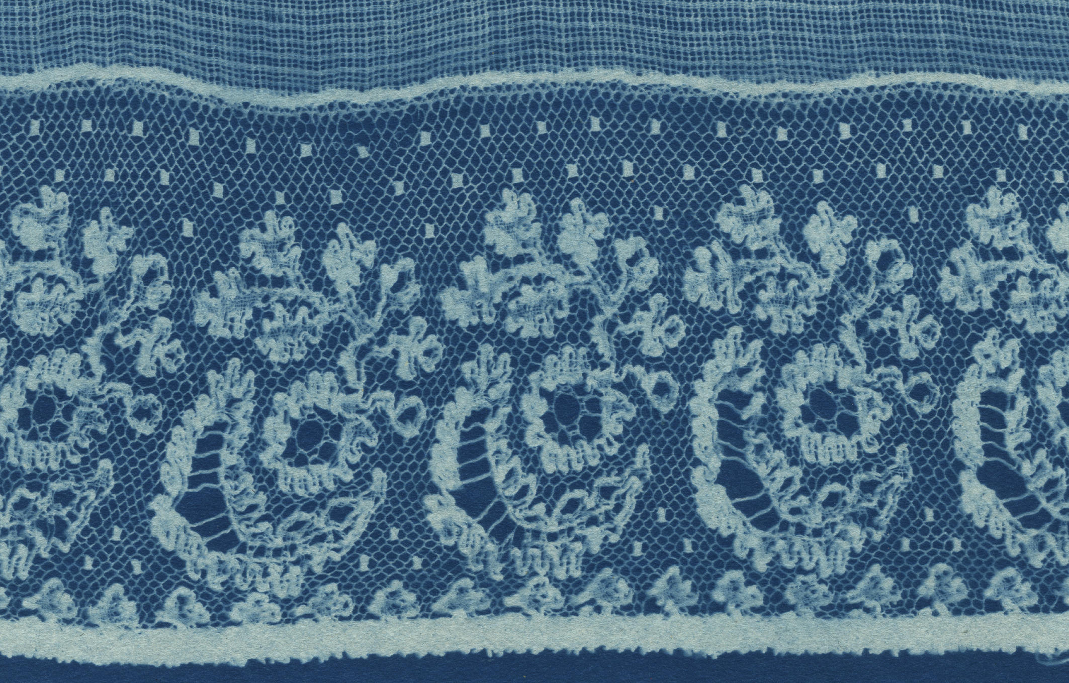 Blauwdruk van een strook Rijselse kloskant, gedragen aan een muts door een vrouw uit Huizen. Dit motief wordt ter plaatse 'Scheepjes-kant' genoemd. De blauwdruk is vervaardigd door NOM-medewerkers tijdens veldwerk in 1944 of 1945.