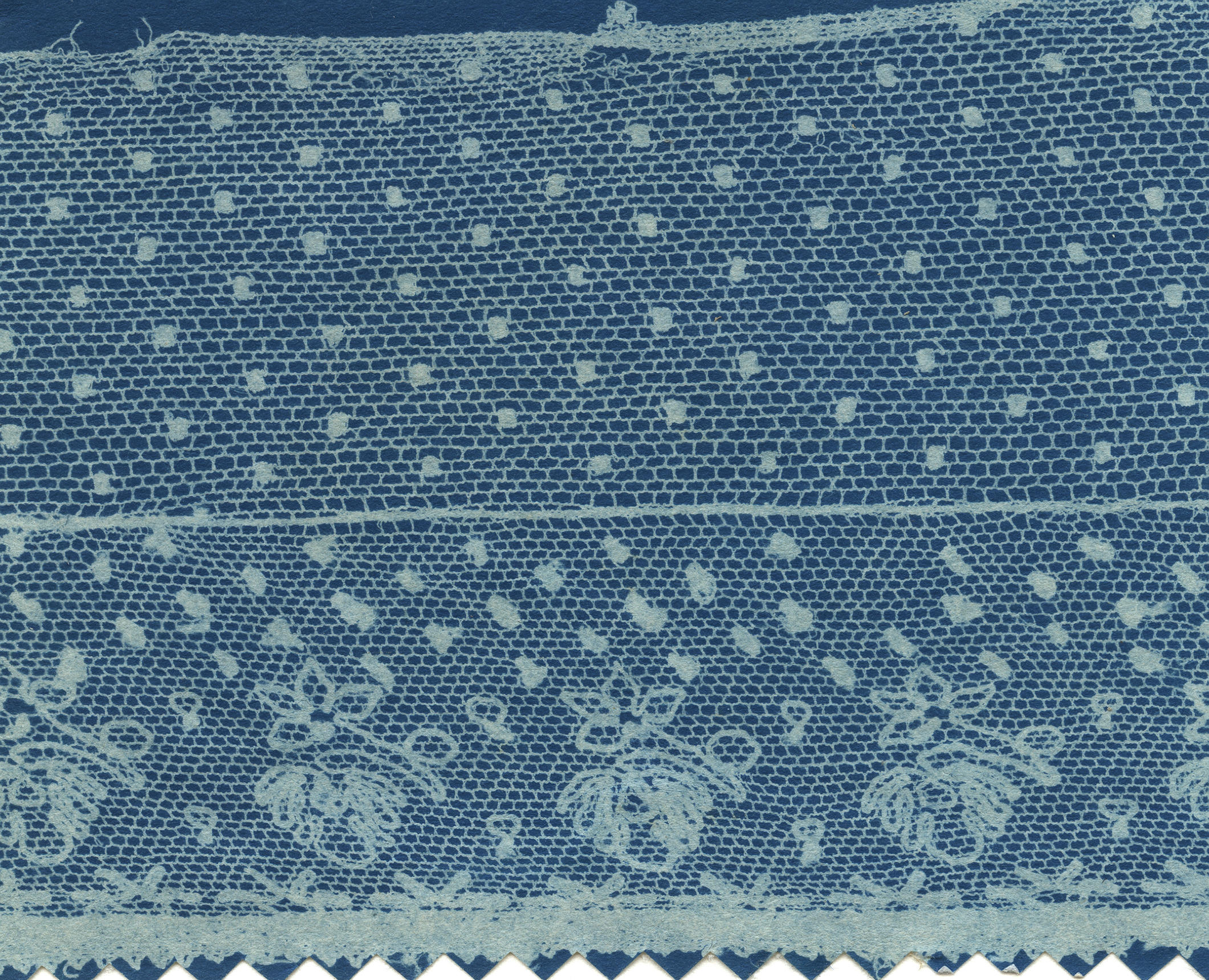 Blauwdruk van een strook geborduurde tule aan een strook stiptule, gedragen aan de 'bocht' (voorstrook) van een kornetmuts bij de kornetdracht door een vrouw uit Huizen. Dit soort kant werd ter plaatse 'uurlingskant' genoemd. De blauwdruk is vervaardigd door NOM-medewerkers tijdens veldwerk in 1944 of 1945.