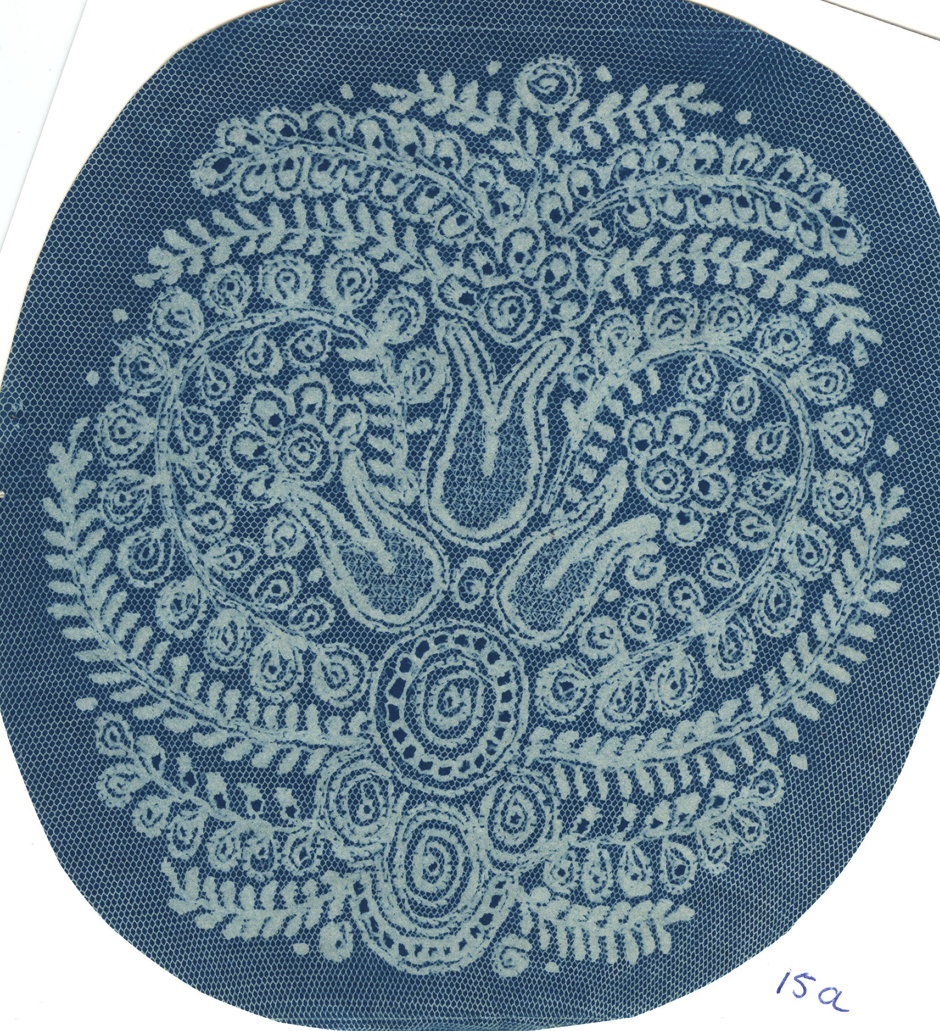 Een blauwdruk met een detail van een bol van een plooimuts, gemaakt van geborduurde tule. Plooimutsen werden gedragen door meisjes tussen 4 en 17 jaar in Huizen. De blauwdruk is vervaardigd door NOM-medewerkers tijdens veldwerk in 1944 of 1945.