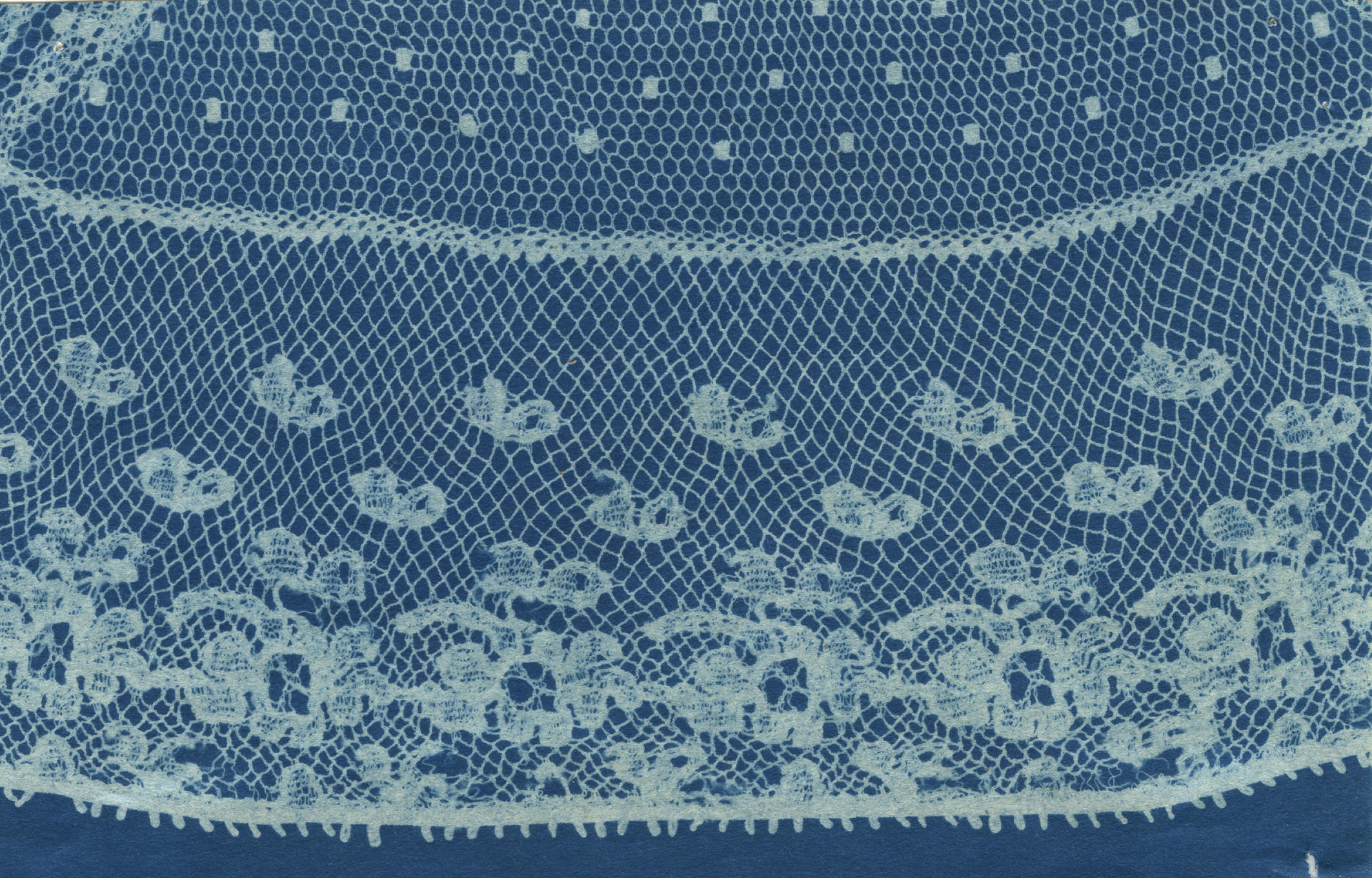 Een blauwdruk van een machinale kant, gebruikt als voorstrook van een plooimuts, gedragen door meisjes tussen 4 en 17 jaar in Huizen. De blauwdruk is vervaardigd door NOM-medewerkers tijdens veldwerk in 1944 of 1945.