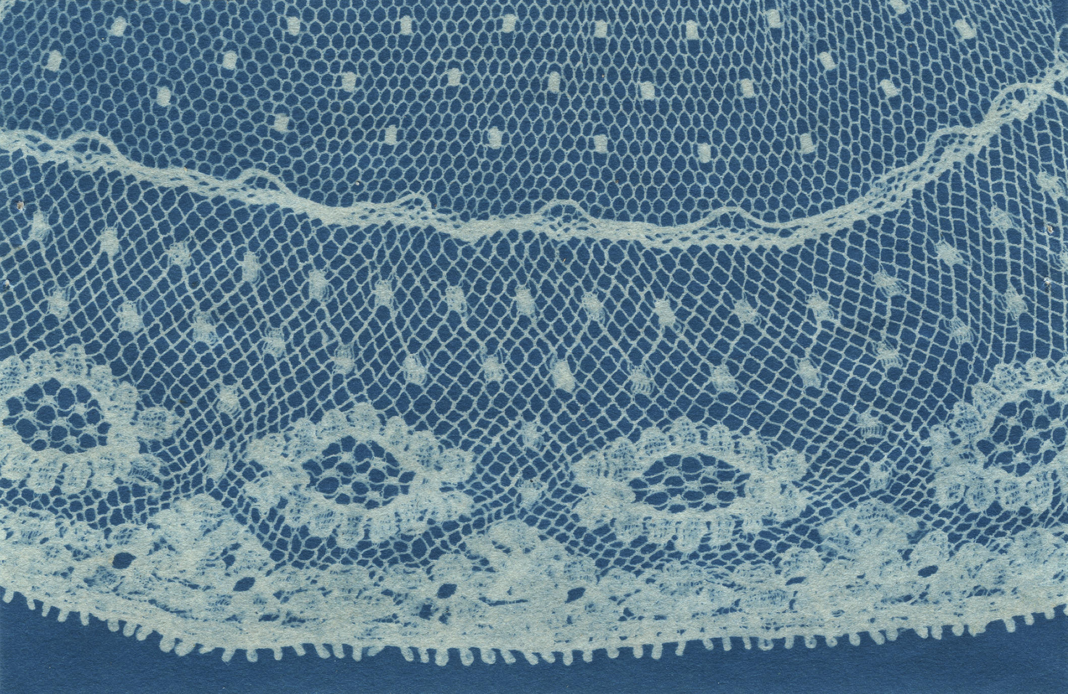 Een blauwdruk met een machinale kant, gebruikt als voorstrook van een plooimuts, gedragen door meisjes tussen 4 en 17 jaar in Huizen. Kant met dit motief wordt wel 'raadjeskant' genoemd. De blauwdruk is vervaardigd door NOM-medewerkers tijdens veldwerk in 1944 of 1945.