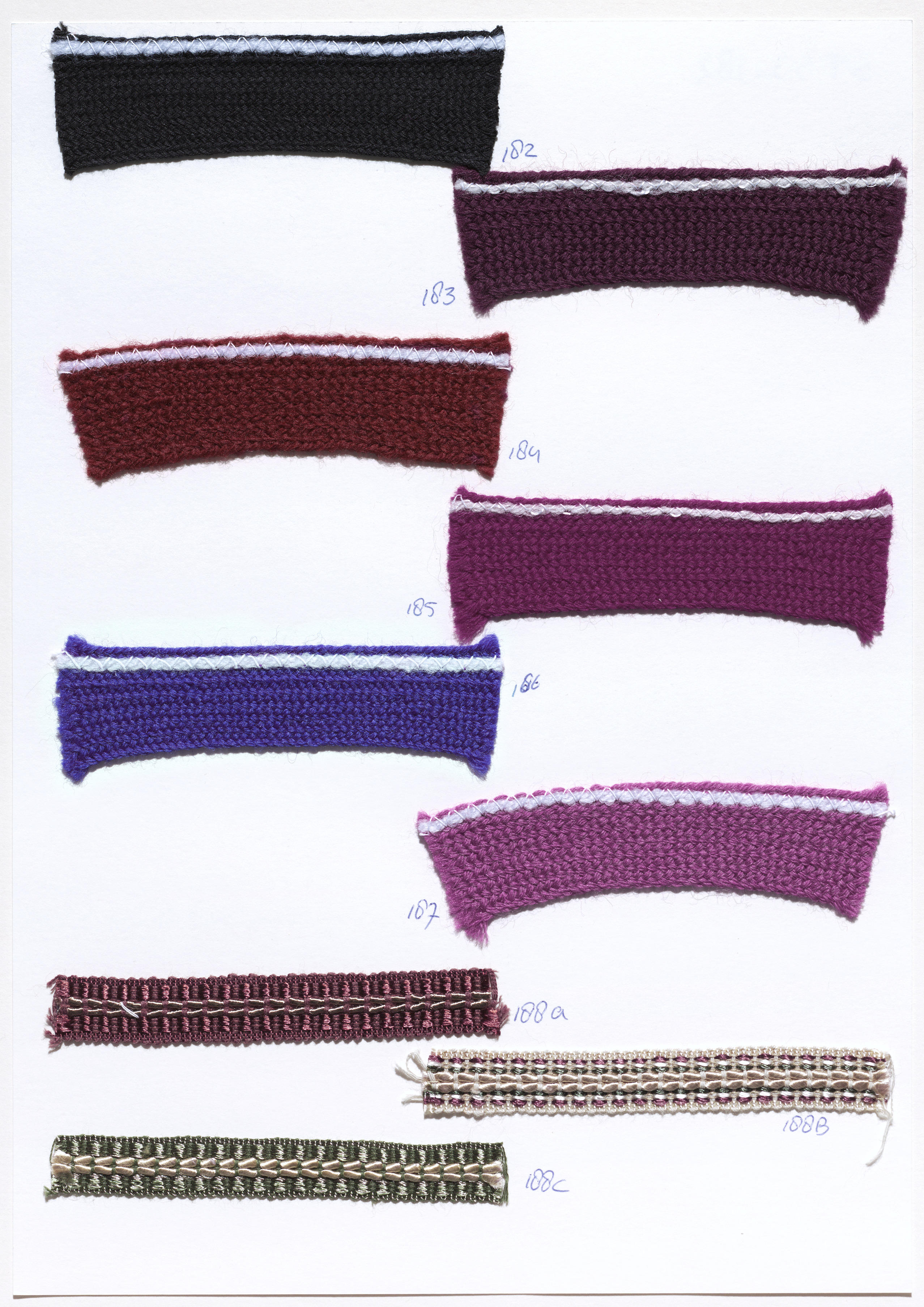 Blad met diverse soorten wollen band voor de afwerking van kleding. Dit band met opgestikte draad wordt ook wel ‘koor’ genoemd en als alternatief gebruikt voor het antieke koor. Onderaan het blad zijn drie soorten 'henne-koor' te zien.