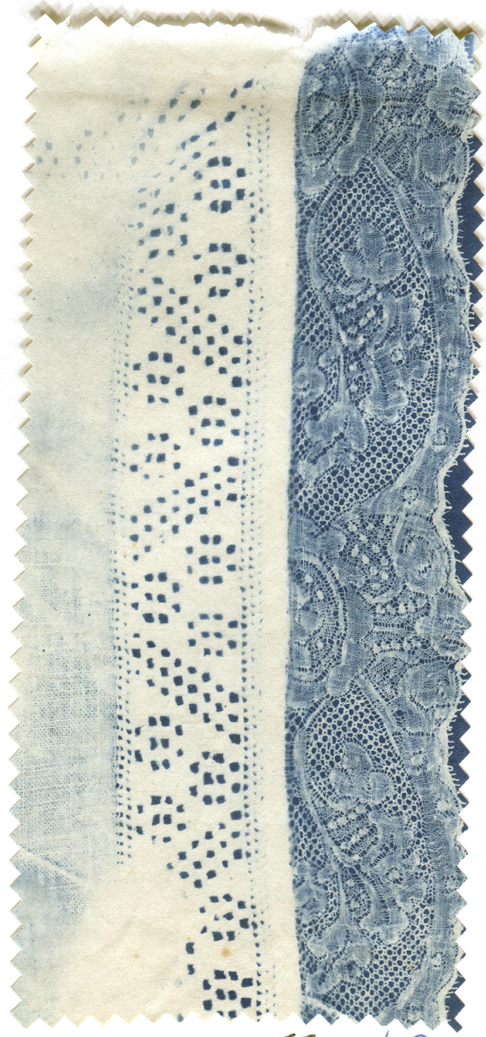 Een blauwdruk met een detail van een doekje met sneewerk en Valenciennes kloskant, gedragen door een vrouw op het eiland Marken. De kant heeft een zogenaamde vijfgaatjesgrond, ook wel 'cinq trous grond' genoemd, en is te dateren omstreeks 1740-1750. De blauwdruk is vervaardigd door NOM-medewerkers tijdens veldwerk in 1943.
